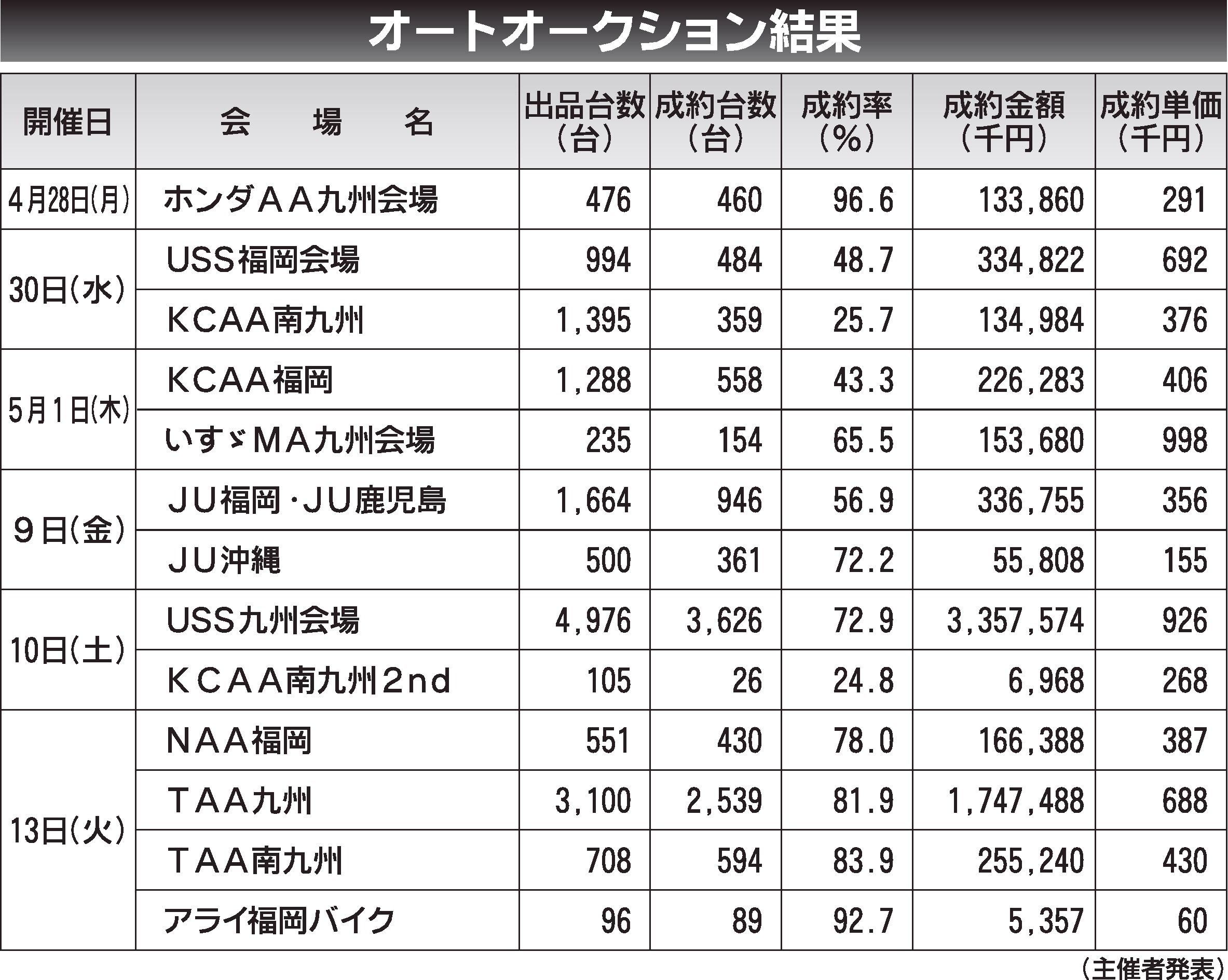 〈オートオークション結果〉九州地区 2025/4/28~5/13