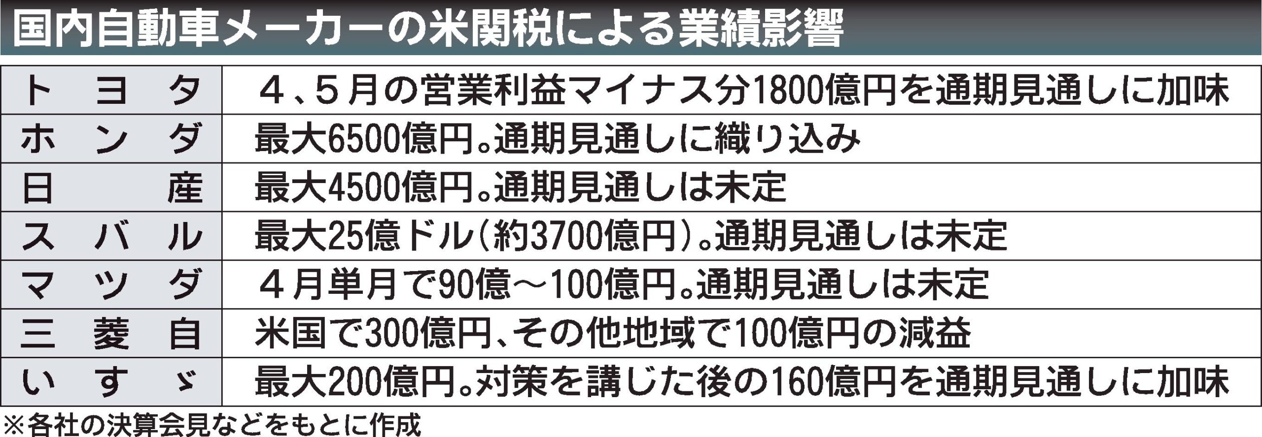 〝トランプ関税〟の影響はどこまで広がるか。上場自動車メーカー7社が決算発表時に示した関税影響額は合計で約1兆7千億円に上る。トヨタ自動車とマツダは1~2カ月に限り影響額を示した。12カ月分に単純換算すると最大で2兆7千億円規模にもなる。世...