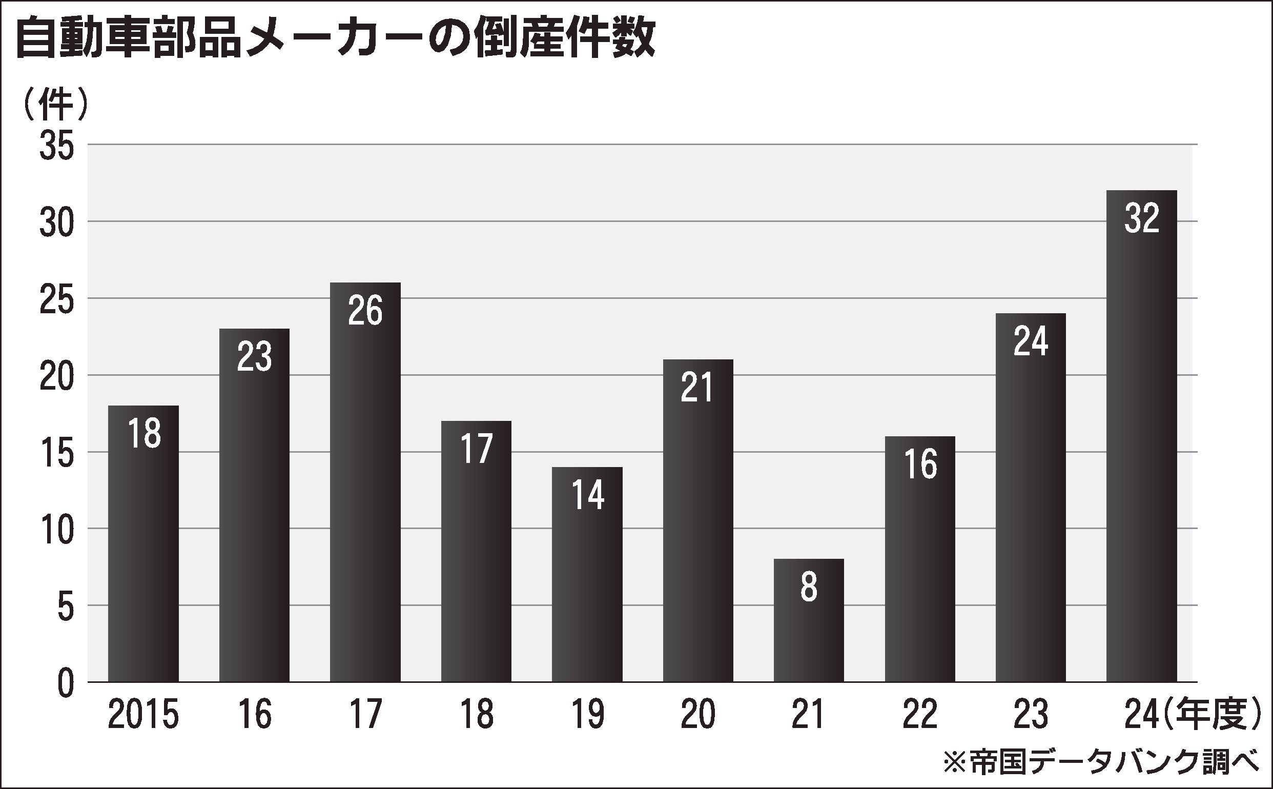 帝国データバンクが発表した「自動車部品メーカーの倒産動向」によると、2024年度の部品メーカーの倒産は32件に上り、直近10年間で最多となった。増加は3年連続。32件のうち、約6割に当たる20件は負債1億円未満の小規模倒産だった。 負債1...