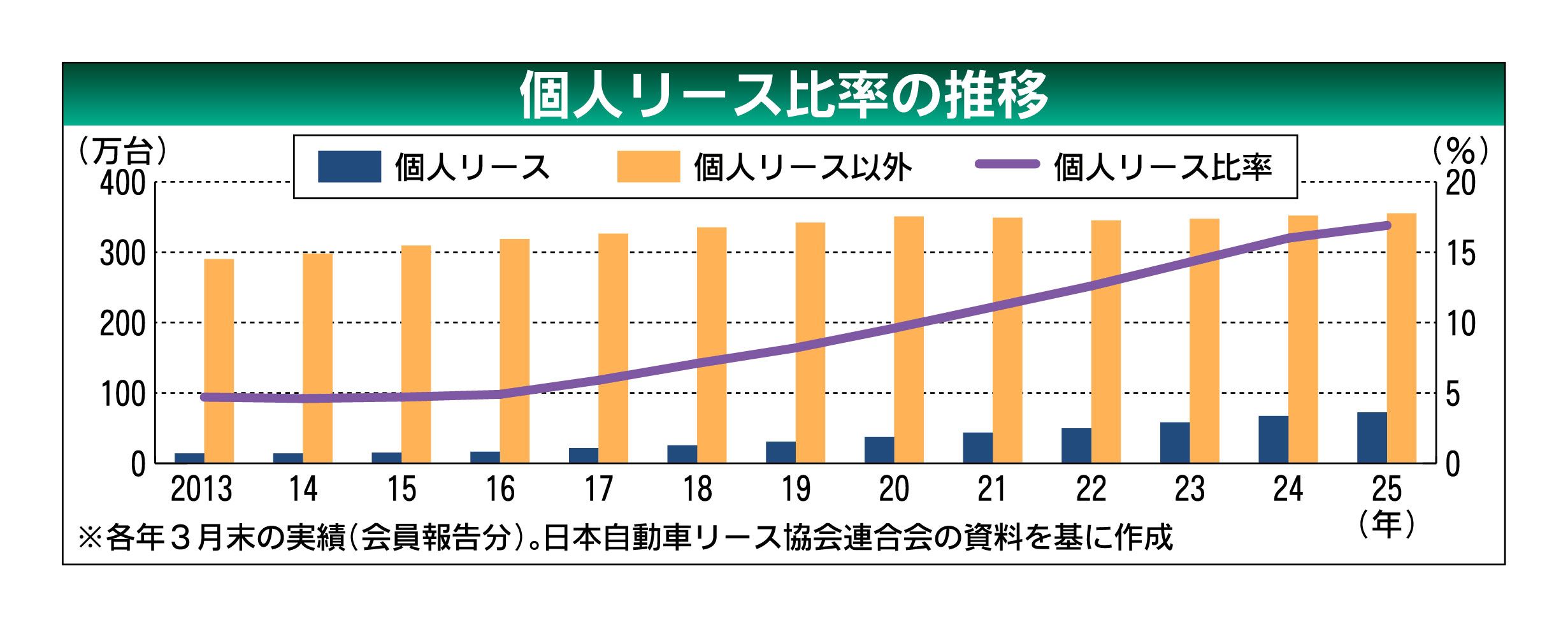 個人リース市場が右肩上がりで成長している。日本自動車リース協会連合会(JALA、髙島俊史会長)が28日に発表した2024年度末の個人リースの保有台数は前年比7.8%増の72万3599台となり、統計開始以来、過去最高を更新した。14年度末の...