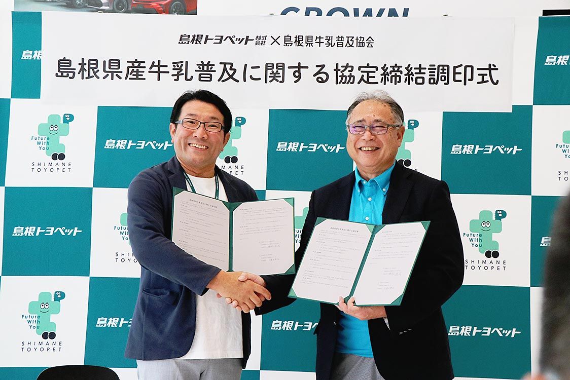 【松江】島根トヨペット(勝部道成社長)は、島根県牛乳普及協会(久保田英治会長)と「島根県産牛乳普及に関する協定」を結び、1日に出雲店(出雲市)で調印式を行った。今後、同社のショールームや各種イベント会場で、牛乳を通じて健康増進に寄与する協...