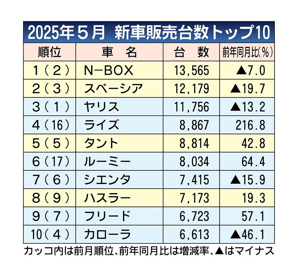 5月の車名別国内新車販売(登録車と軽自動車の合計)は、ホンダ「N-BOX(エヌボックス)」が2カ月ぶりの首位だった。販売台数は前年同月比7.0%減の1万3565台と減少したが、首位圏内のスズキ「スペーシア」やトヨタ「ヤリス」がより減少幅が大きかった。前年に認証不正の影響を受けていたトヨタ「ライズ」やトヨタ「ルーミー」といったダイハツ生産車が10位圏内に復帰した。