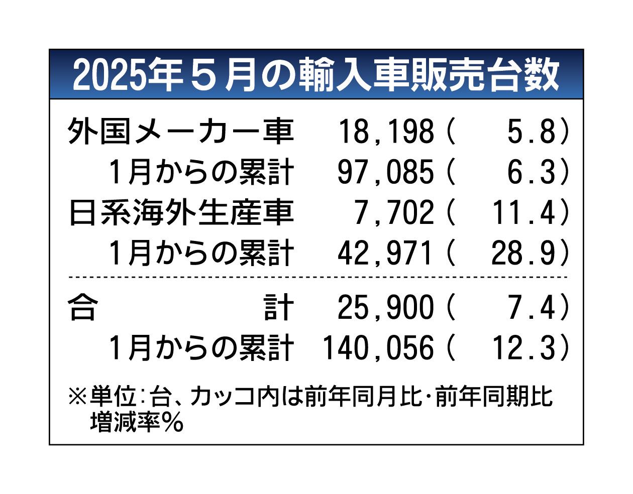 日本メーカー車を含む輸入車全体は同7.4%増の2万5900台で、5カ月連続で増加。登録車全体に占めるシェアは12.7%で5月として過去4番目の水準だった。
