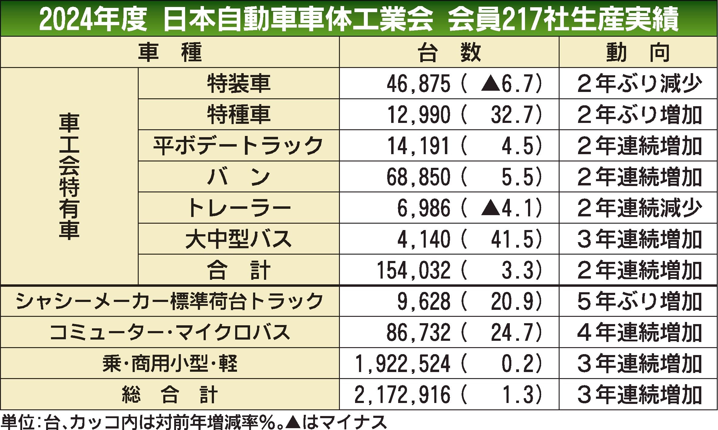 日本自動車車体工業会(車工会)がまとめた会員217社の2024年度の車体生産実績は、3年連続で増加した。新車メーカーからの受託生産車などを除く加盟企業特有の非量産車も2年連続のプラスだった。 車種別では、車いす移動車や警察車両、医療防疫車...
