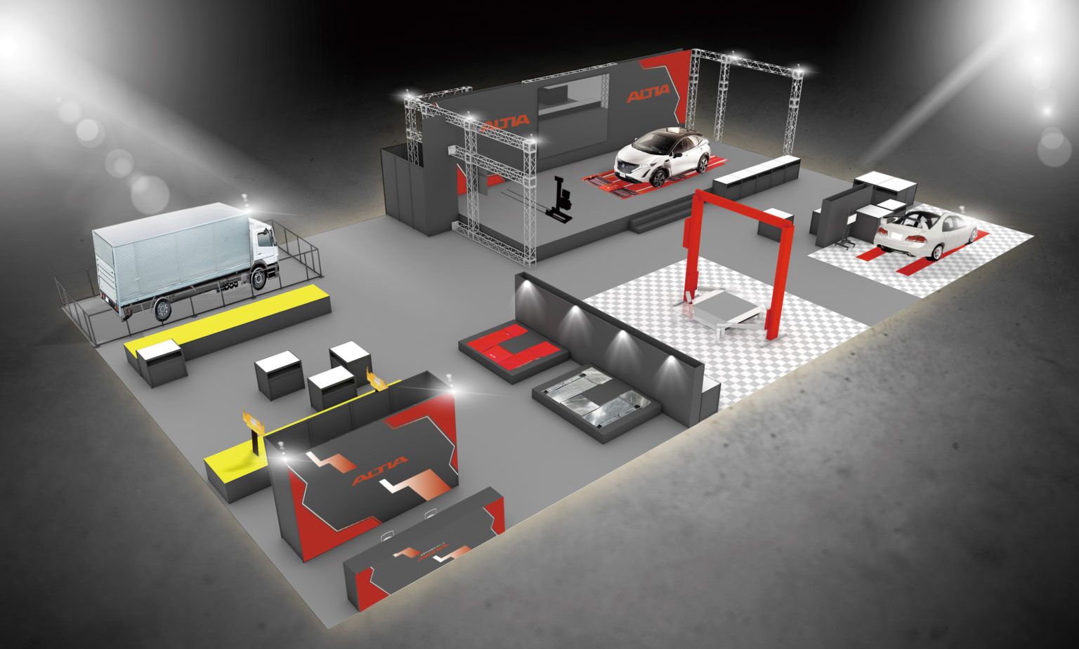 アルティアは「近未来の整備工場の実現と共創」をテーマに、ブースコンセプトに「Go for NEXT―Gen」を掲げ、最新の自動車整備関連機器を展示するとともに「コンプライアンス強化」「安全・効率化」「環境対策」の3つの観点から事業者の課題を解決に導く様々なツールを提案する。