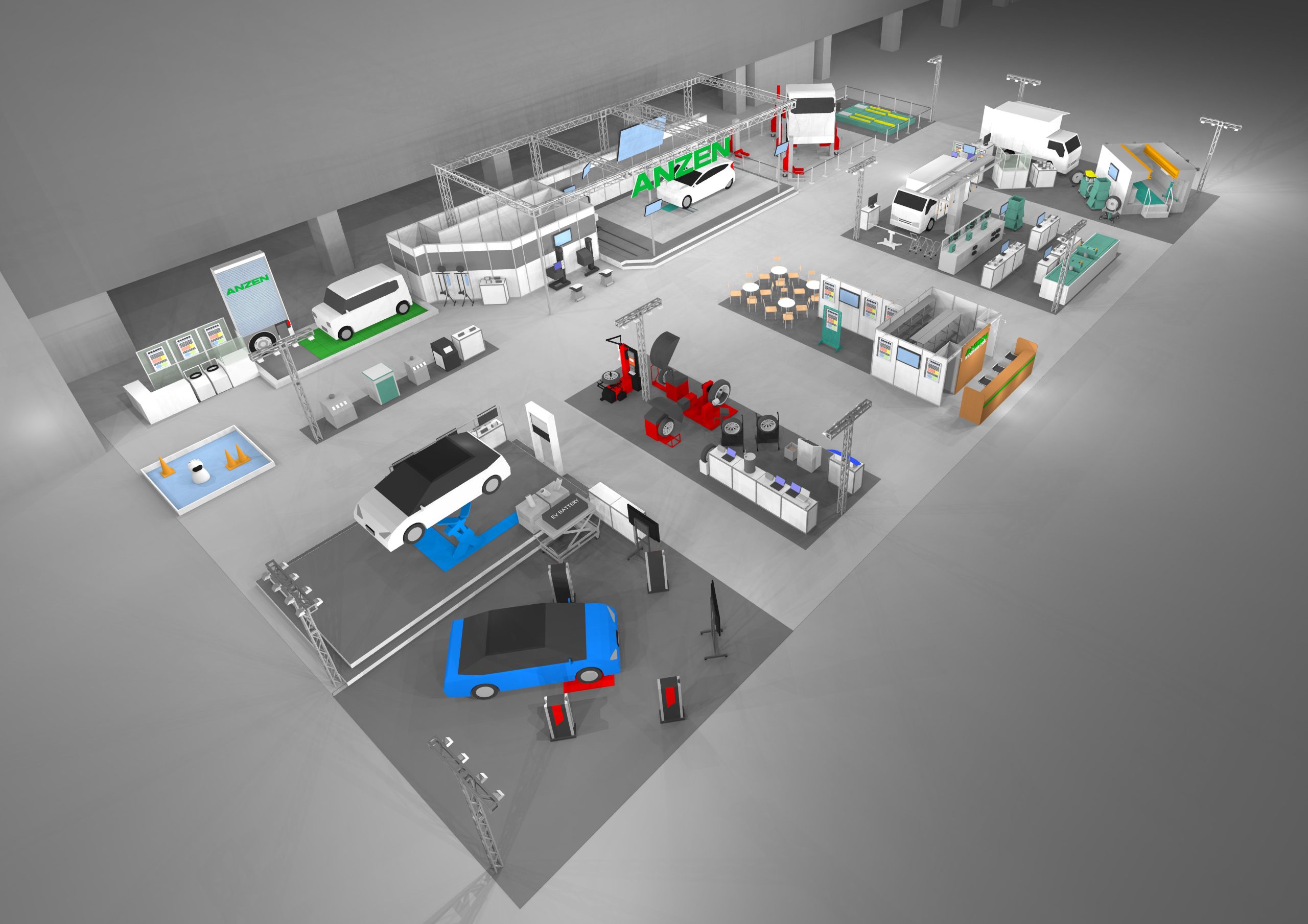 ブースは①車検②乗用車➂大型車④洗浄⑤メンテナンス⑥カーメーカー向け設備⑦補助金相談の7コーナーで構成。約100点の商品を展示する。