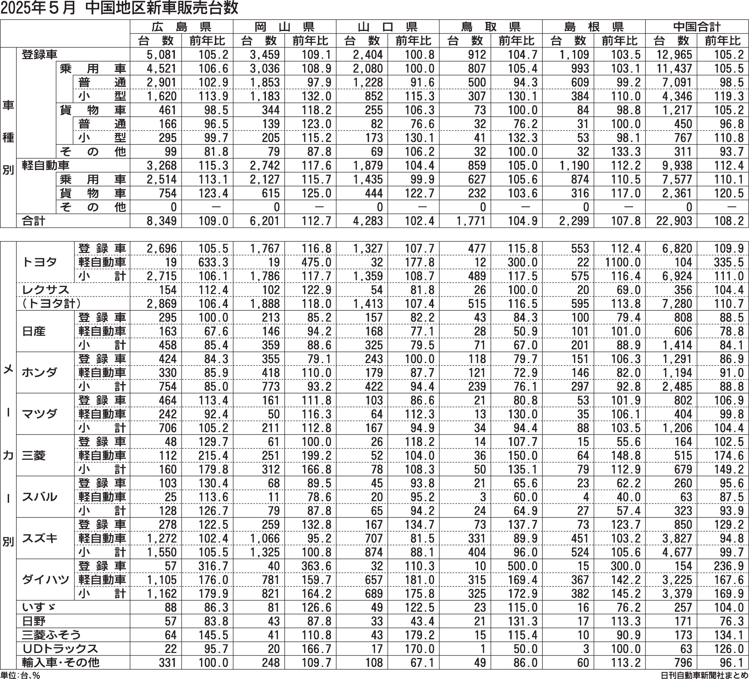 2025年5月の中国地区新車販売台数(登録車と軽自動車の合計)は、前年同月比8.2%増の2万2903台となった。5カ月連続で前年台数を上回り、中国5県すべてが前年台数を上回ったが、岡山県以外は伸長率が1桁台にとどまった。登録車の台数は同5...