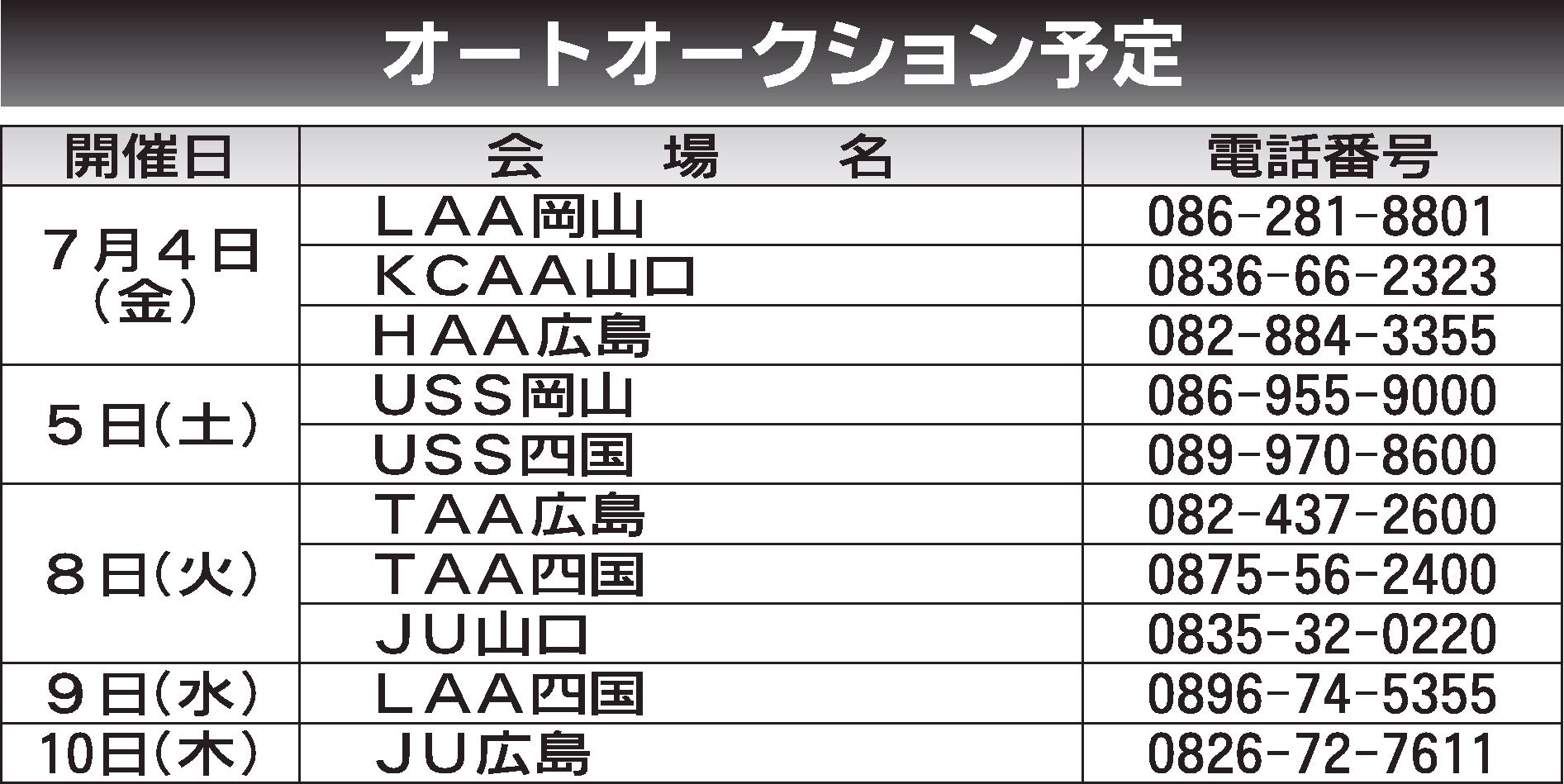 〈オートオークション予定〉中四国地区 2025/7/4~10