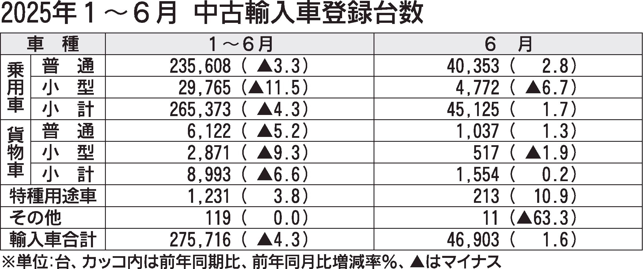 日本自動車輸入組合(JAIA、ゲルティンガー剛理事長)が10日発表した2025年上期(1~6月)の中古輸入車の登録台数は、前年同期比4.3%減の27万5716台となり、2年ぶりに減少した。昨年の同時期は一部メーカーによる新車の供給制約で納期が短い中古車の販売が旺盛だったが、新車の納期が正常化したことで中古車需要が一服したもよう。国産車を含めた全体の中古車登録・届け出台数と比べて減少率が大きかった。