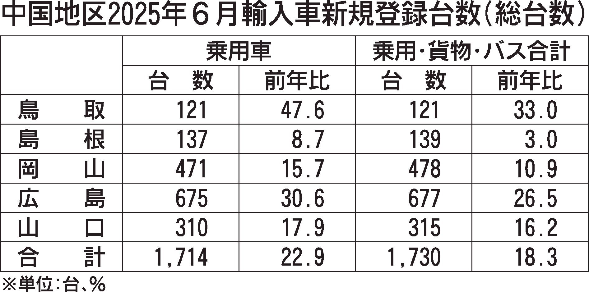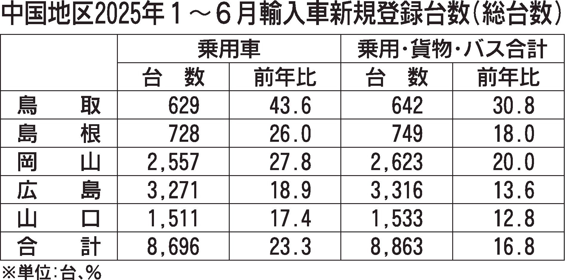 日本自動車輸入組合(JAIA)の発表によると、2025年上期(1~6月)の中国地区の輸入車新規登録台数(外国メーカー車と日本メーカー車)は、前年同期比16.8%増の8863台で中国5県全県でプラスとなり、4期ぶりに前年超えとなった。 乗用...