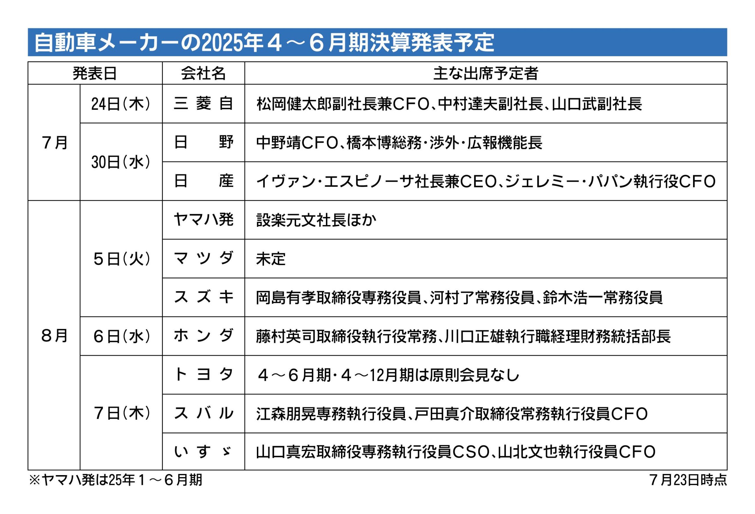 自動車メーカー9社の2025年4~6月期決算発表が24日からスタートする。米国に輸出する自動車の追加関税が25%から12.5%へと下がることが決まり、各社が通期の業績見通しに関税影響をどう織り込むかが注目される。一方、日本以外の国との関税...