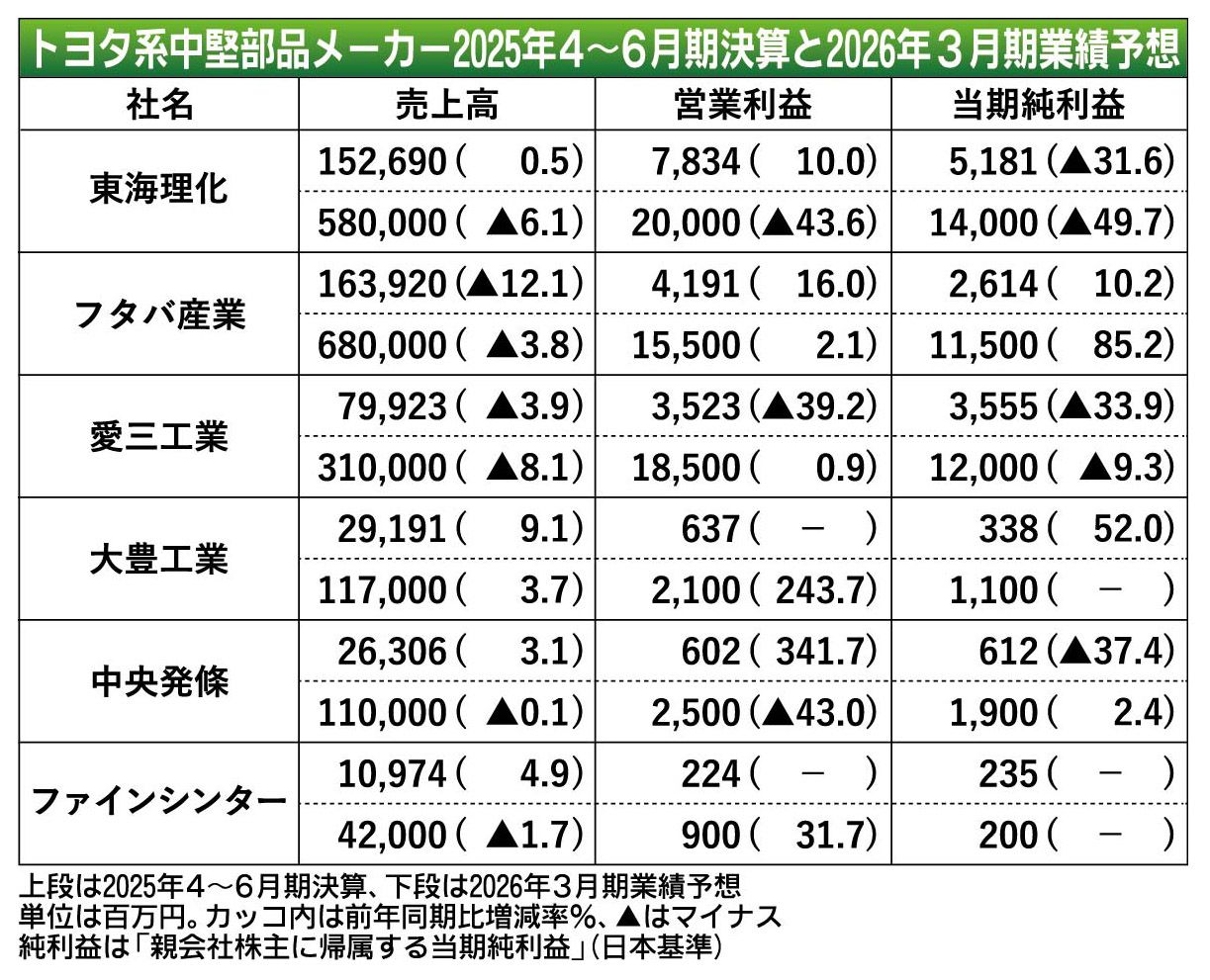 トヨタ自動車系中堅部品メーカー6社が30日発表した2025年4~6月期連結決算は、トヨタの好調な車両生産などを受け、5社が営業増益(黒字化含む)だった。日米貿易交渉の合意を踏まえ、通期見通しに関税影響を織り込む企業も相次いだ。5社が期初の...