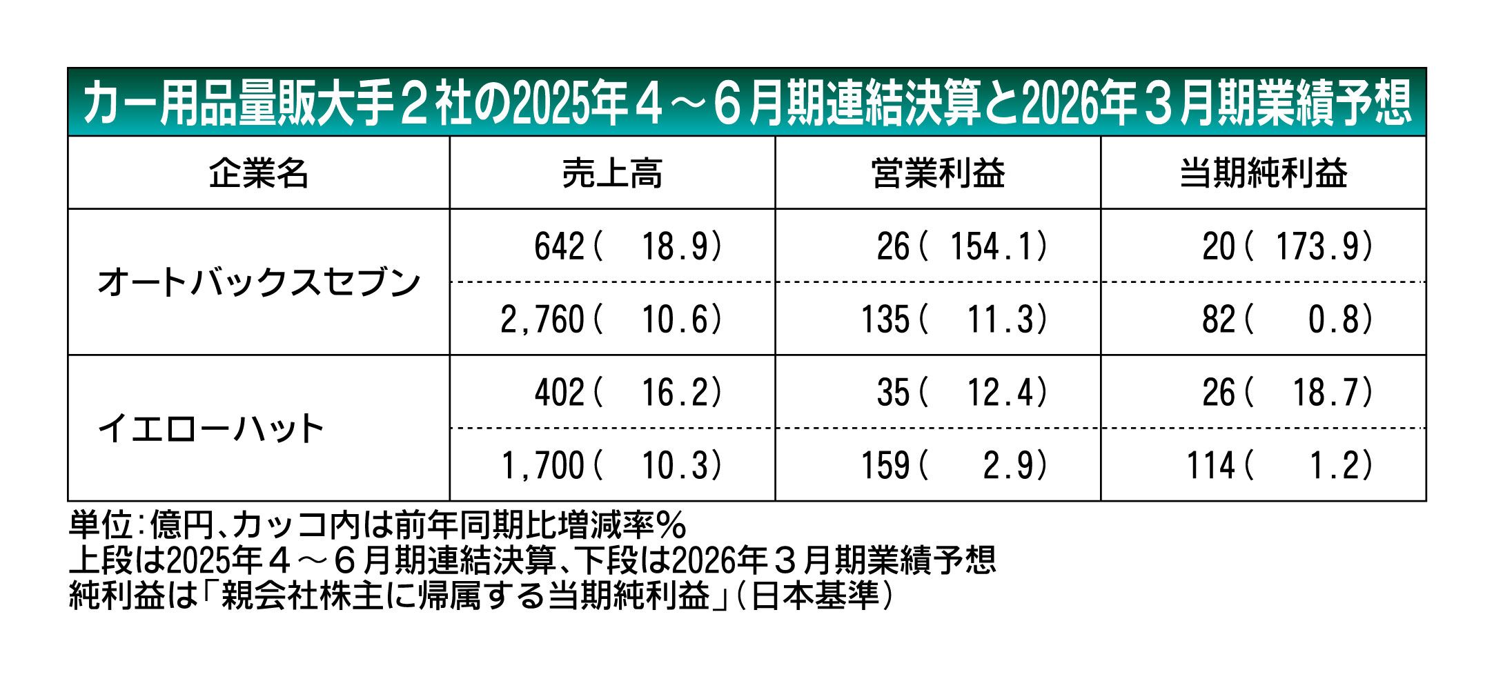 カー用品小売り上場2社が発表した2025年4~6月期の連結決算は、そろって増収増益だった。オートバックスセブンは売上高と営業利益が2年ぶり、純利益が3年ぶりに前年同期を上回った。イエローハットは売上高、営業利益、純利益が同期として過去最高...