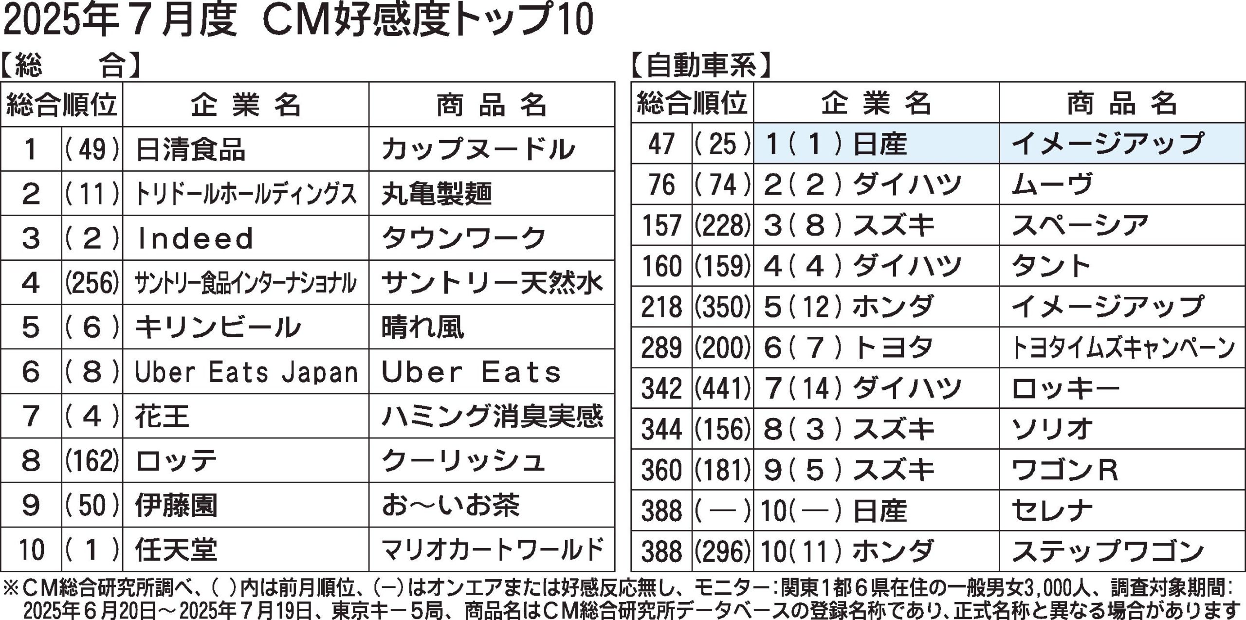 CM総合研究所(関根心太郎代表、東京都千代田区)は、2025年7月度のCM好感度ランキングを公表した。総合ランキングでは日清食品「カップヌードル」が3カ月ぶりの首位を獲得。自動車業類は25カ月連続してトップテンを逃した。