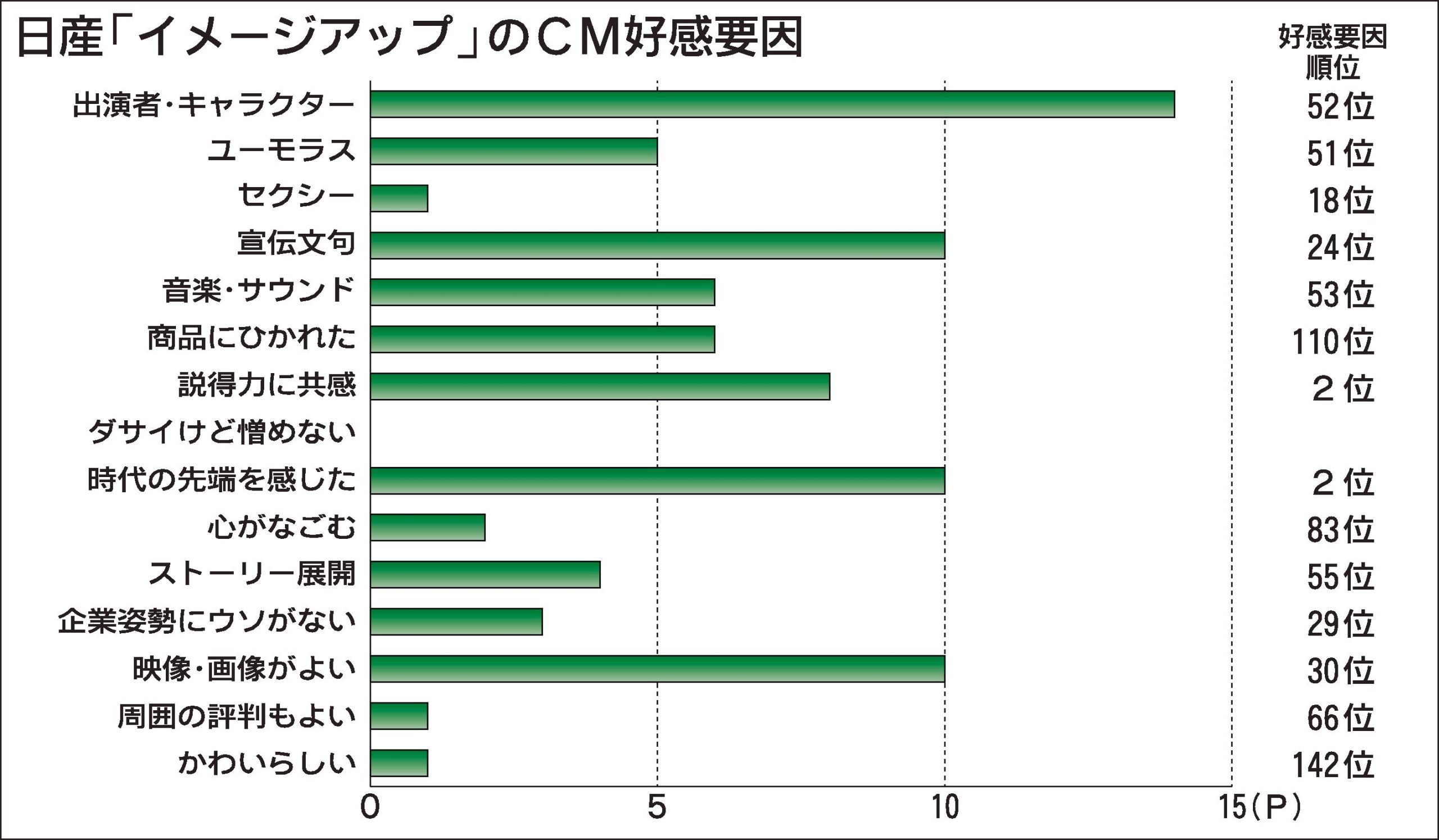 支持層は男性が中心で、特に60歳代以上の男性から高スコアを得た。CM好感要因は「出演者・キャラクター」「時代の先端を感じた」「宣伝文句」で好評価。「時代の先端を感じた」では総合2位にランクインした。視聴者からは「自動運転が急速に進んでいると感じ、すごいと思った」「技術の日産と思った」とのコメントが寄せられた。鈴木の表情豊かな自然体の姿によって、先進技術のアピールに成功しているようだ。