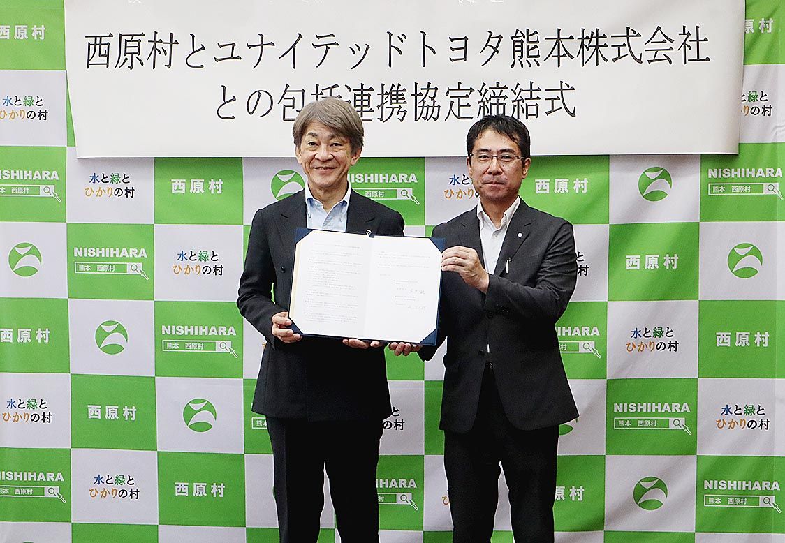 【熊本】ユナイテッドトヨタ熊本(西治三朗社長)は、熊本県西原村と包括連携協定を締結した。地域交通事業などの地域振興に相互に協力して取り組んでいく。同村役場で締結式が開かれ、西社長と吉井誠村長が協定書に調印した。 同社は親子向けのキャンプイ...
