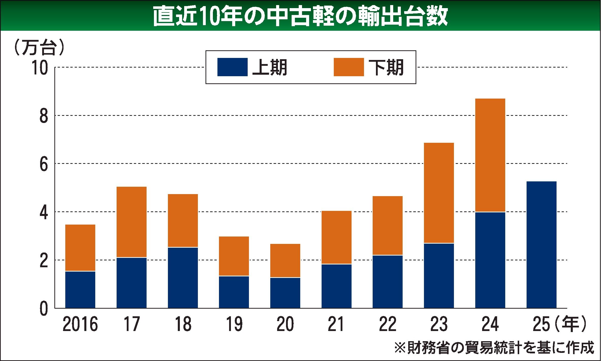 中古の軽自動車が海外で静かな人気を呼んでいる。輸出数はこれまで年間5万台ほどだったが、昨年は9万台近くまで増え、10万台超えも視野に入った。もともとスポーツカーなどで好事家の需要はあったものの、車室の広さや小型車との性能差が縮まったことで...