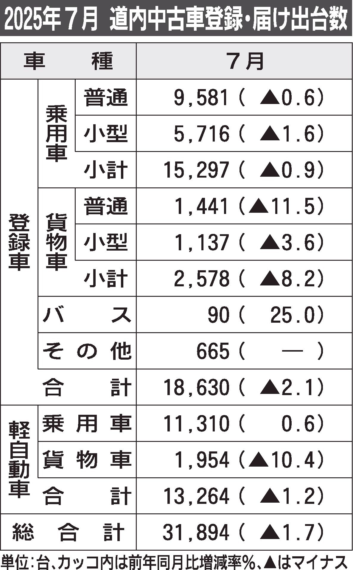 7月の道内中古車登録・届け出台数は、3万1894台(前年同月比1.7%減)で、登録車、軽自動車ともに2カ月ぶりに前年同月の台数を下回った。 日本自動車販売協会連合会の中古車登録台数と全国軽自動車協会連合会の軽自動車中古車販売台数をまとめた...