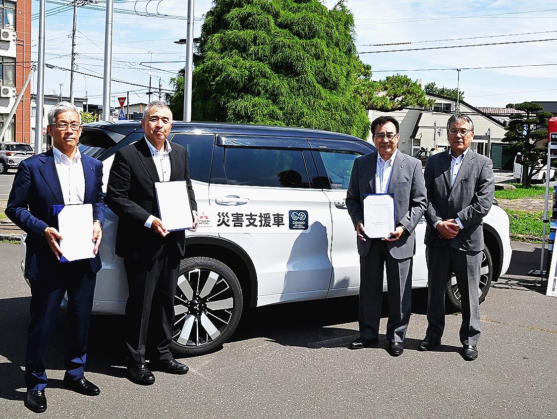 【八雲】函館中央三菱(小笠原正吾社長)と三菱自動車は25日、八雲町と災害協定を結んだ。災害時に電動車などを非常用電源として提供するほか、町民の防災意識向上に向けた取り組みなどで連携する。八雲町が災害時に電動車を活用する災害協定を結ぶのは初...