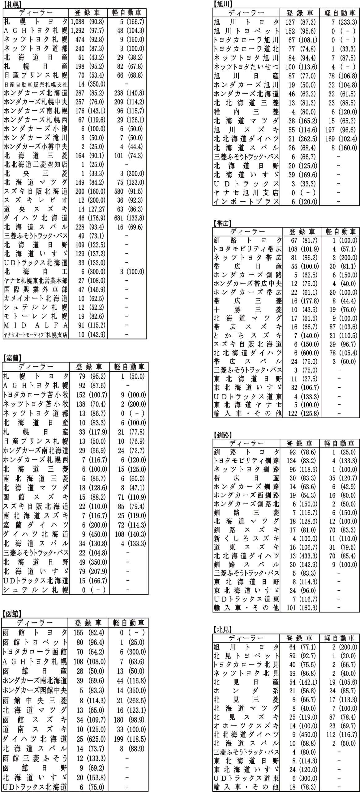 〈7月度全道管内別ディーラー別新車登録・届け出台数(カッコ内は前年同月比)〉札幌管内ホンダ系・スズキ系の登録台数は自販連正会員分