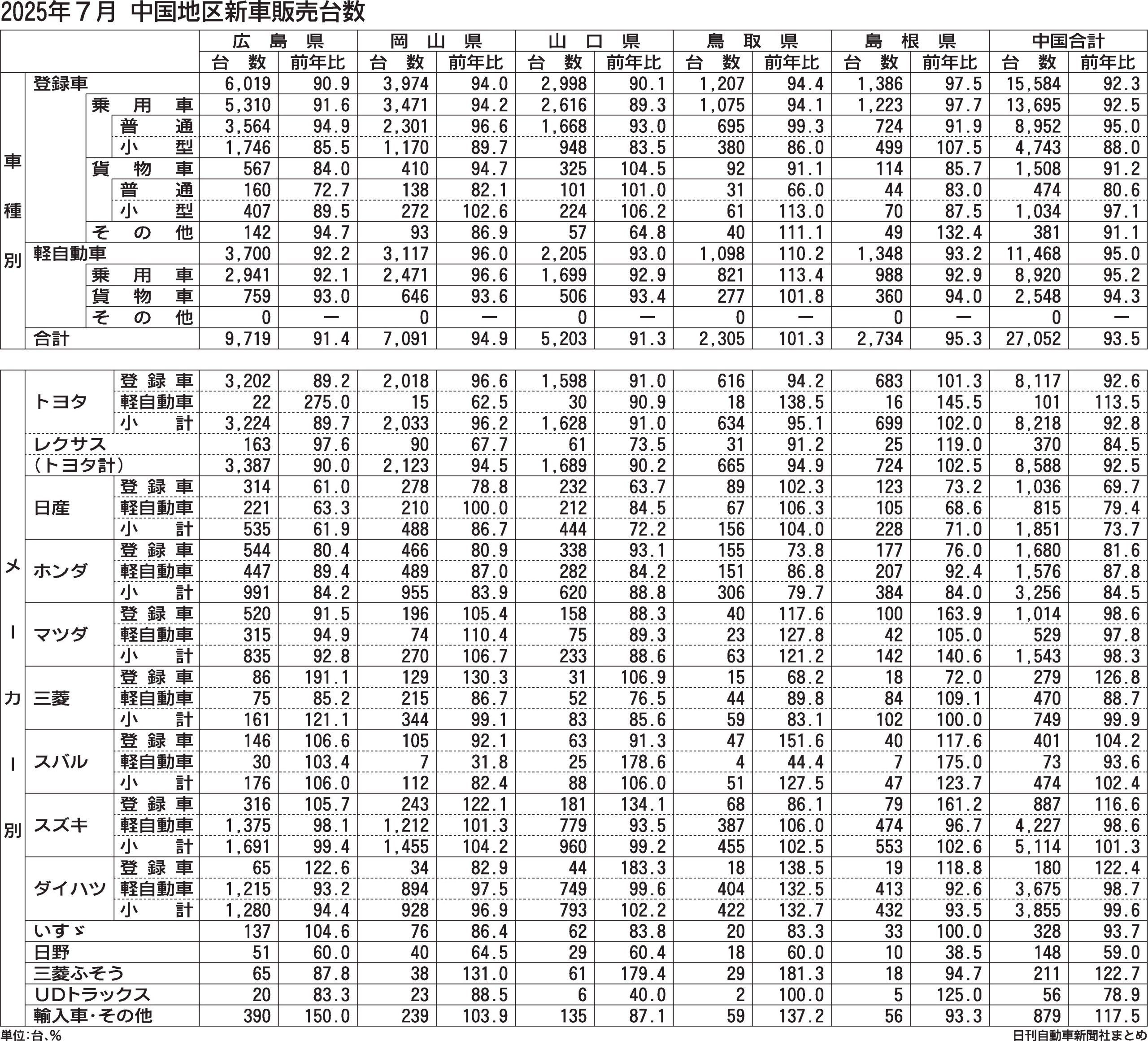 2025年7月の中国地区新車販売台数(登録車と軽自動車の合計)は、前年同月比6.5%減の2万7052台となり、7カ月ぶりに前年台数を下回った。認証不正などで販売台数を落としていた反動で前年を上回る水準が続いていたダイハツが同0.4%減とな...
