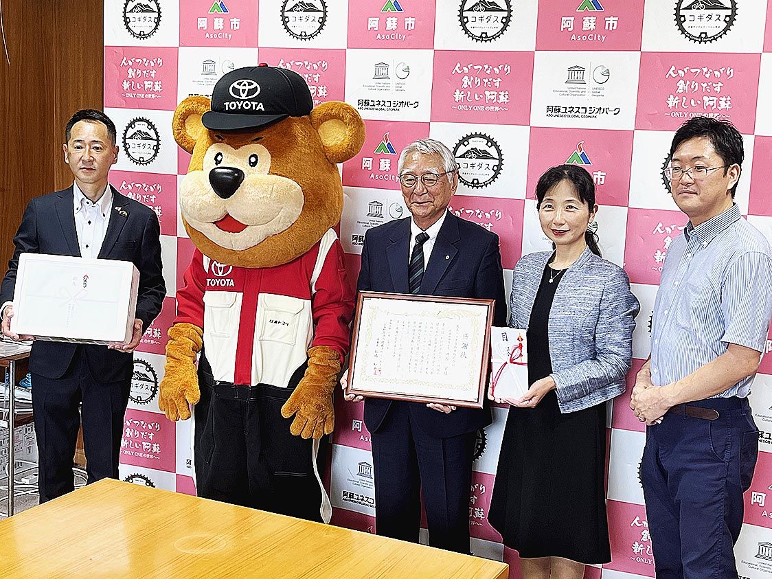 【熊本】熊本トヨタ(井原宏社長)は阿蘇地方の環境保全に取り組む阿蘇グリーンストック(松嶋和子理事長=阿蘇市長)に浄財100万円を贈った。今年で12回目となり、寄付総額は1245万8千円。阿蘇市役所で贈呈式を開いた。 寄付金は、同社がハイブ...