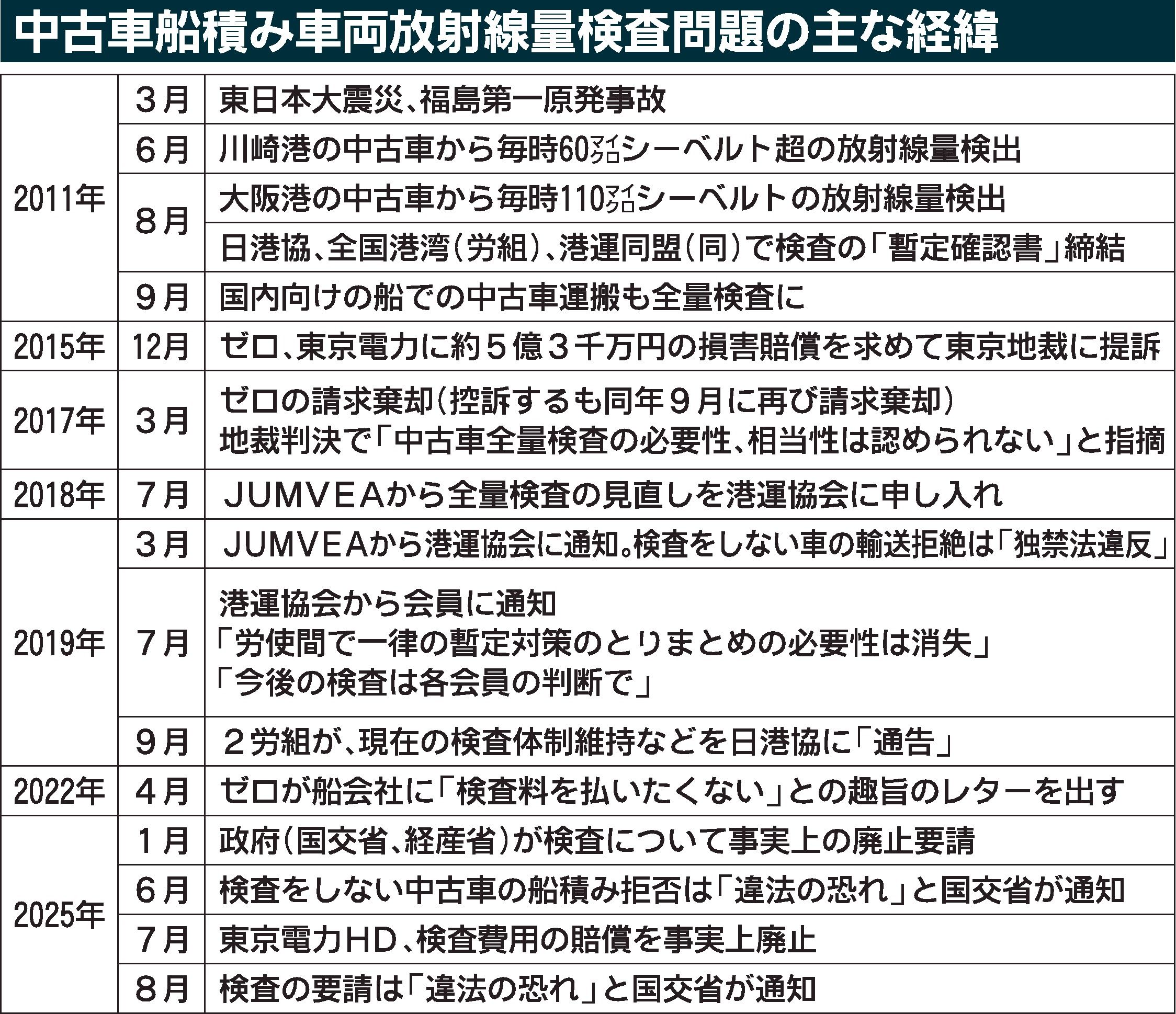 福島第一原発事故の後に船積みする中古車の放射線量検査が今も続く問題で「放射線量検査の実施要求は港湾運送事業法に抵触する恐れがある」という通知を国土交通省が業界団体に出したことが分かった。法的根拠がない放射線量検査を輸出事業者などに強要する...