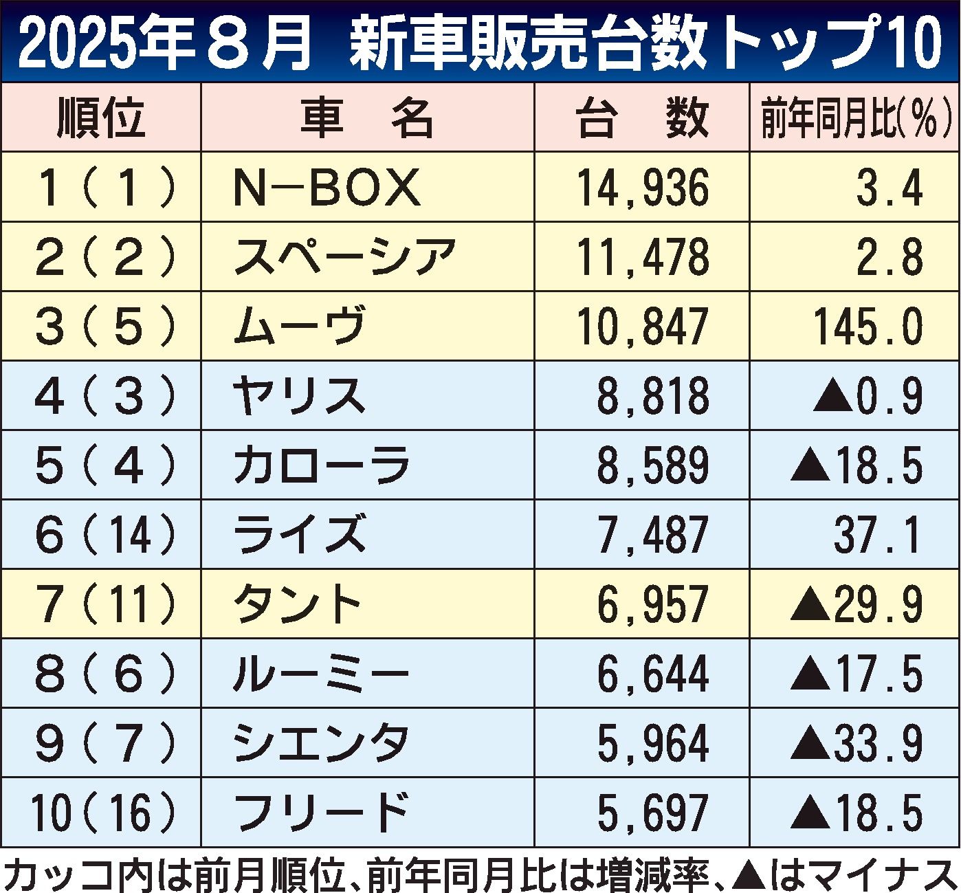 エヌボックスは需要と供給がかみ合い、2位以下に3千台以上の差をつけて首位を独走した。スペーシアも前年並みを確保。ムーヴは新型車効果で前年同月比2.4倍と大きく伸びた。