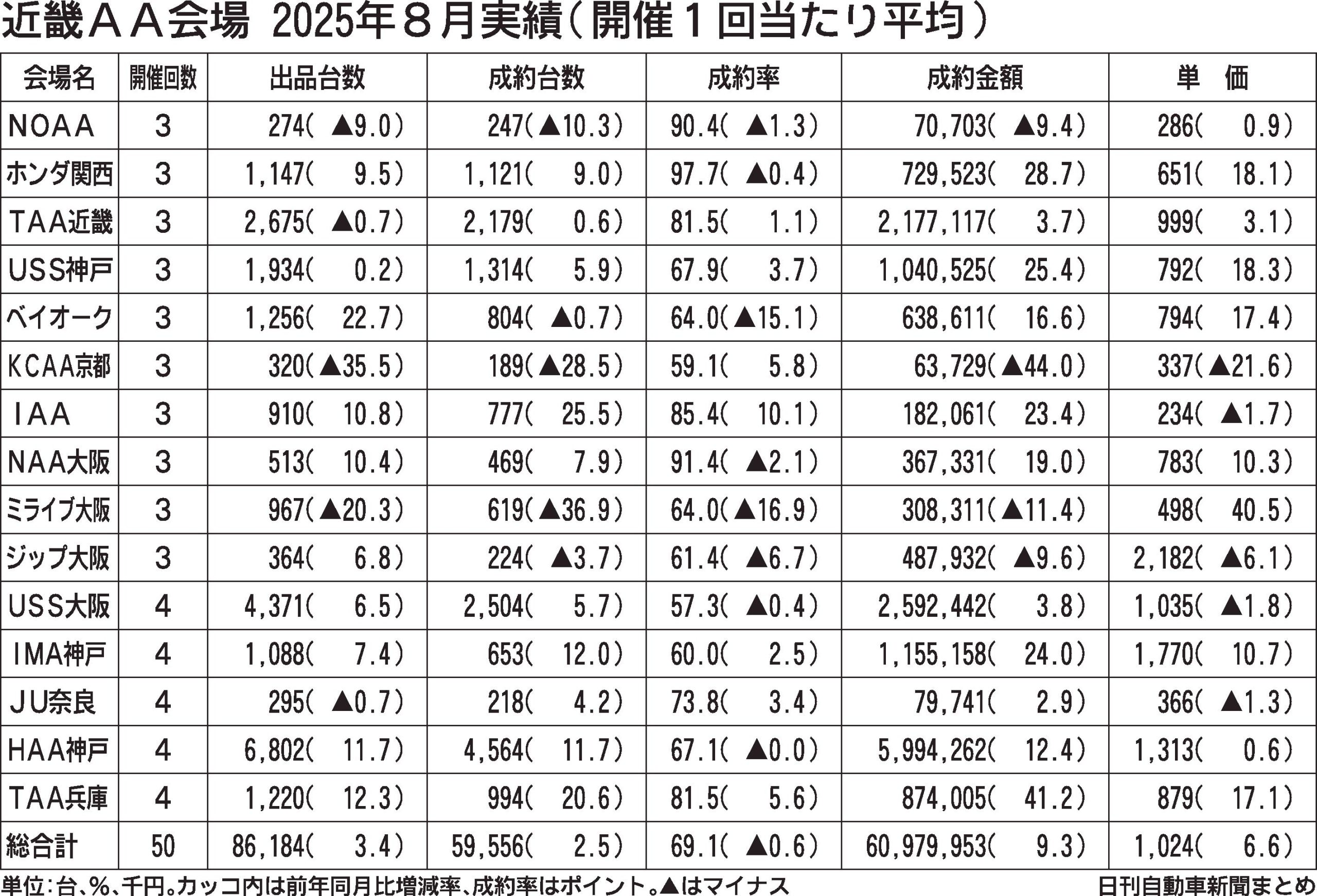 近畿地区の中古車オークション(AA)15会場の8月実績がまとまった。開催回数は前年同月比3回減の50回。出品台数の総合計は同3.4%増の8万6184台で、8カ月連続の前年超えとなった。 会場別の出品台数は、HAA神戸の2万7208台が最多...