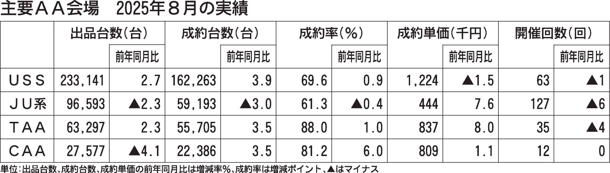 中古車オークション(AA)の主要4事業者の8月実績は、日本中古自動車販売商工組合連合会(JU中商連、塚田長志理事長)とシーエーエー(CAA、斉藤啓太社長、愛知県豊田市)の出品台数が前年を下回った。7月まですべての事業者がプラスとなっていた...