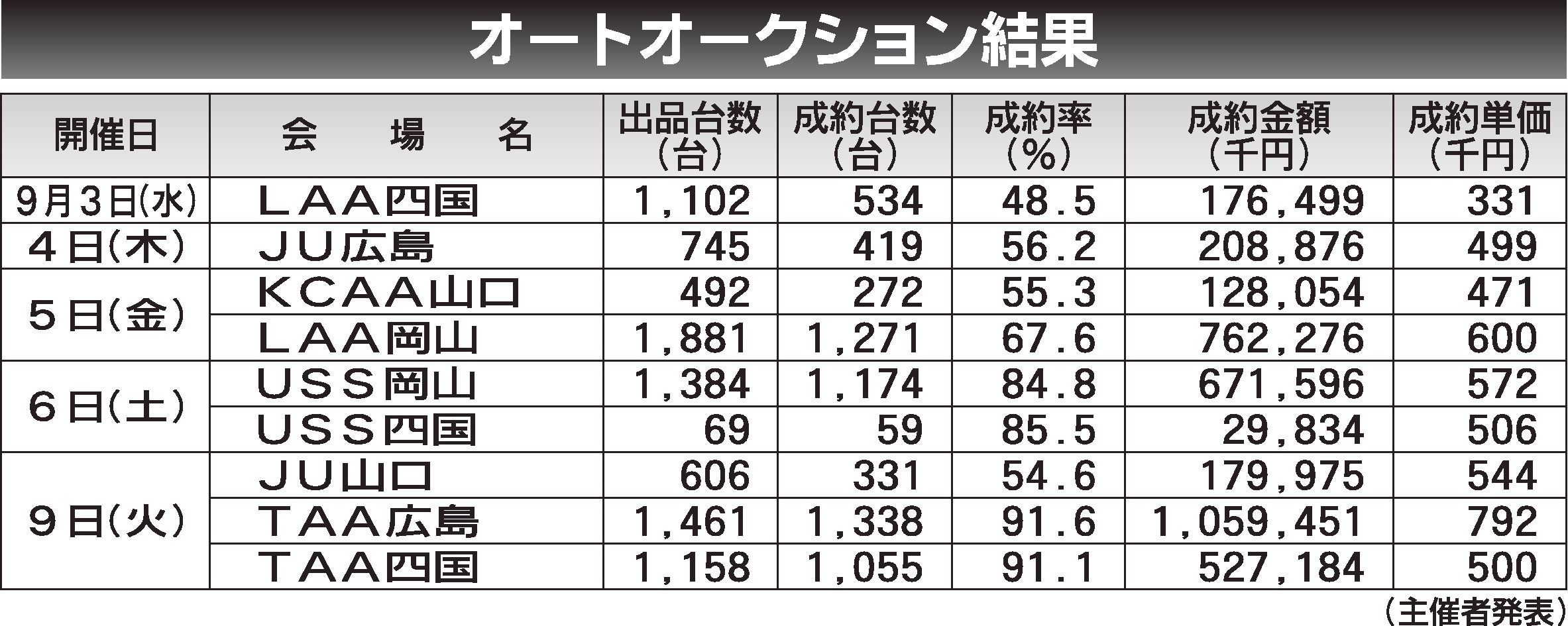 〈オートオークション結果〉中・四国地区 2025/9/3~9