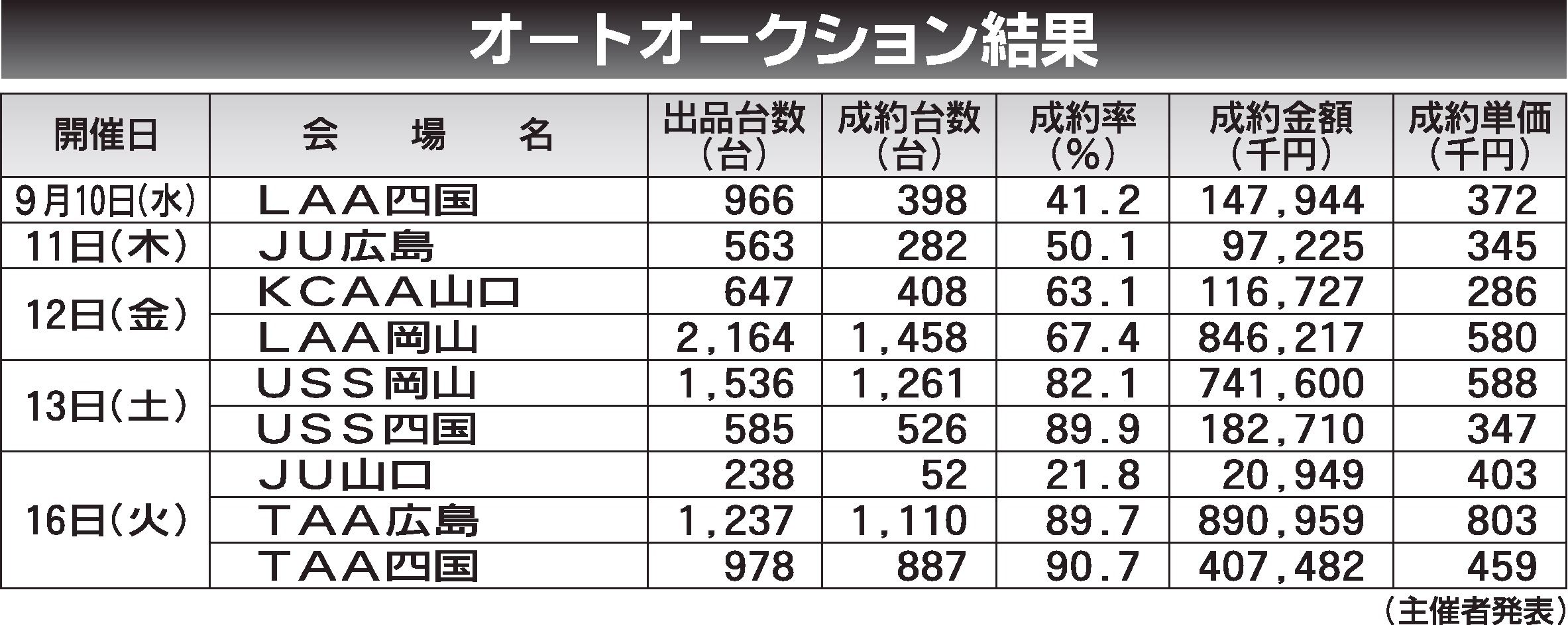 〈オートオークション結果〉中・四国地区 2025/9/10~16