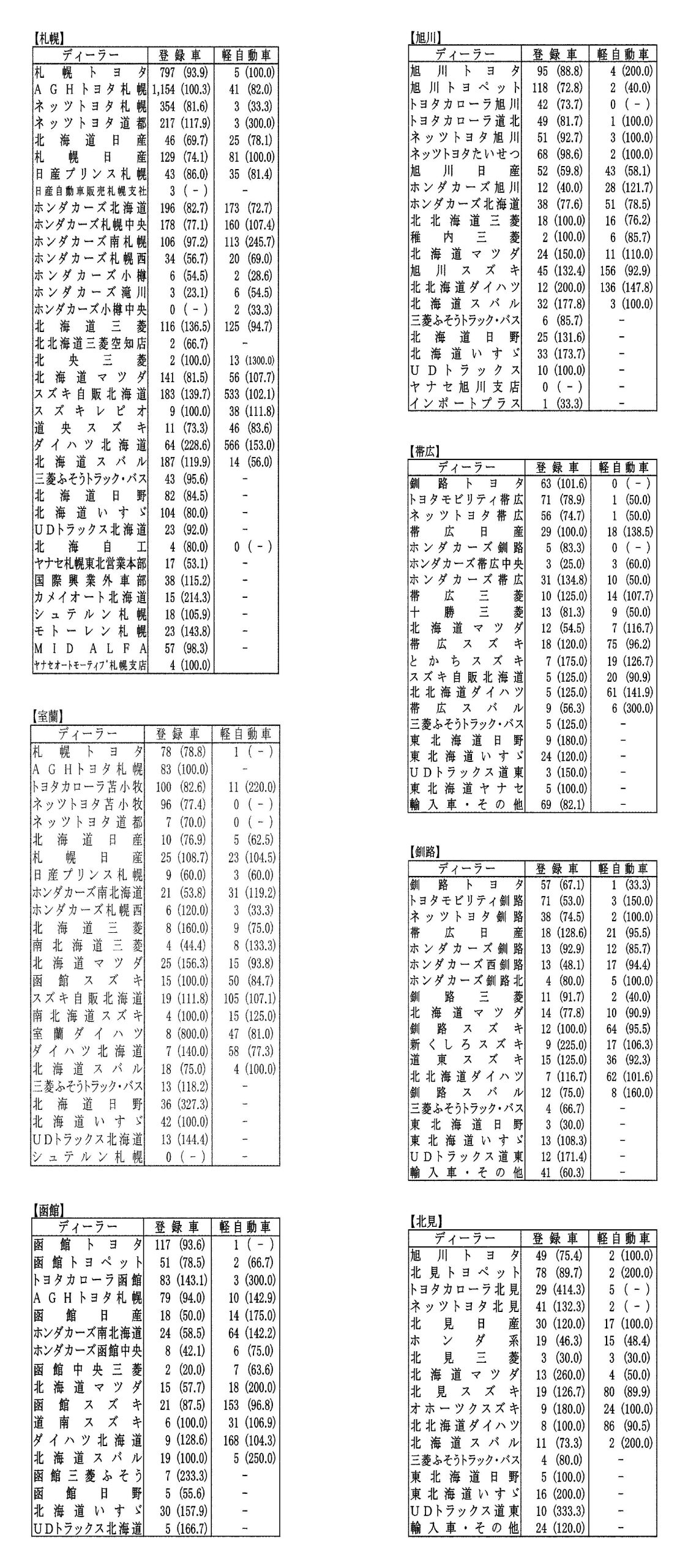〈8月度全道管内別ディーラー別新車登録・届け出台数(カッコ内は前年同月比)〉札幌管内ホンダ系・スズキ系の登録台数は自販連正会員分
