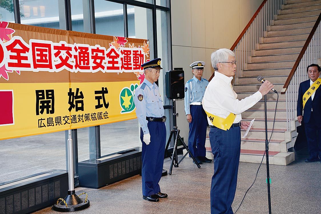 秋の全国交通安全運動を前に、広島県などで組織する広島県交通対策協議会(湯﨑英彦会長=広島県知事)は、広島県庁で「秋の全国交通安全運動開始式」を行った。 山根健嗣副知事は「これからの季節は日没時間が早まり、交通事故発生の危険性が高まる。皆さ...