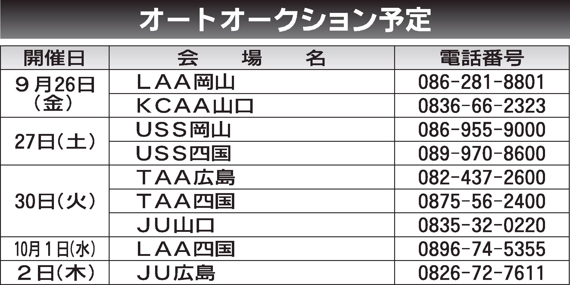 〈オートオークション予定〉中・四国地区 2025/9/26~10/2
