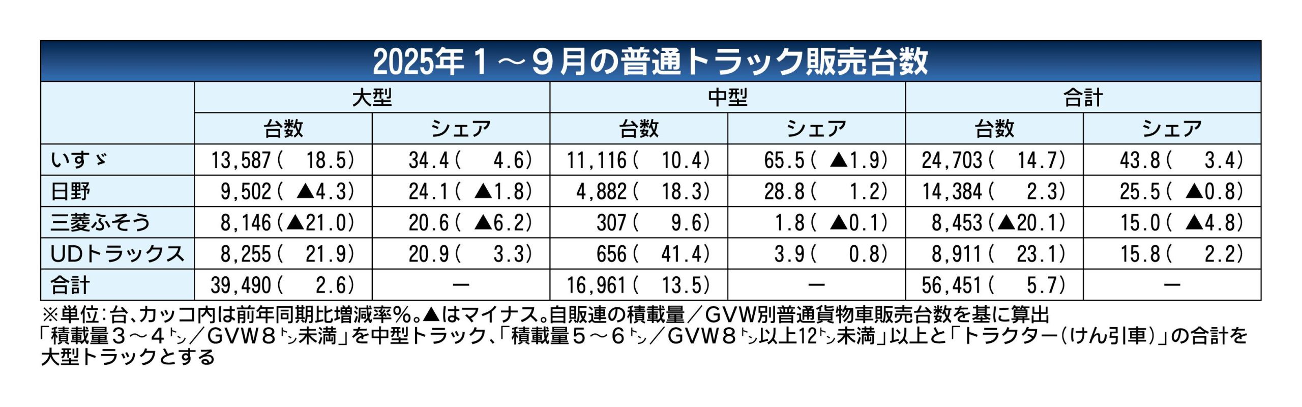 2025年1~9月の普通トラック(積載量4トン級以上、中・大型の合計)の国内新車販売は前年同期比5.7%増の5万6451台で、前年実績を3年連続で上回った。堅調な中型車需要が市場を下支えしている。 メーカー別では、いすゞ自動車が同14.7...