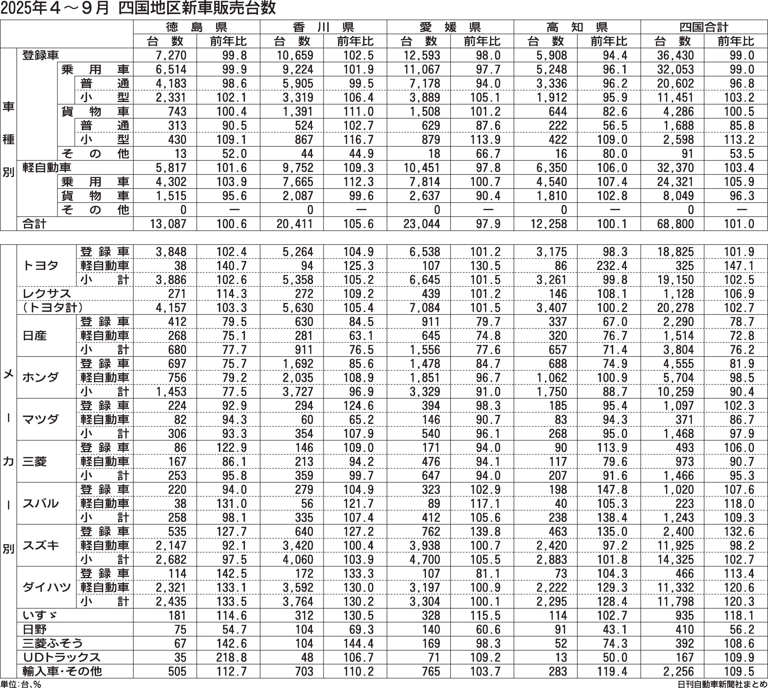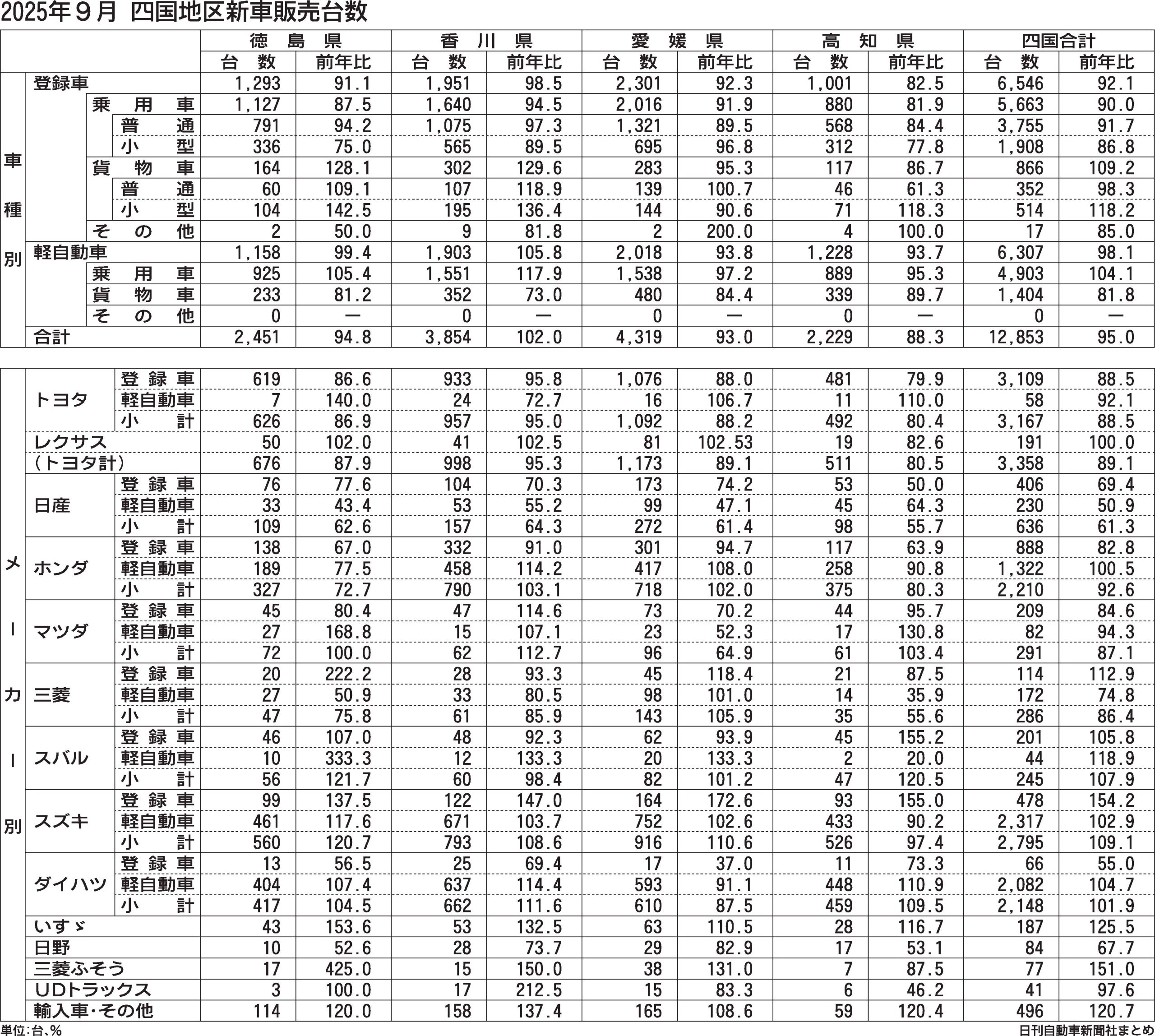 2025年11月の四国地区新車販売、5カ月連続マイナス 普通貨物車は2桁増