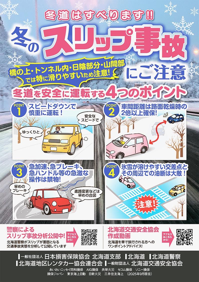 日本損害保険協会(損保協、舩曵真一郎会長=三井住友海上火災保険社長)の北海道支部(赤羽千恵美委員長=同社執行役員)は、冬期の自動車のスリップ事故防止をドライバーに呼び掛けるポスターとチラシを作成した。冬道を安全に運転するためのポイントを紹...