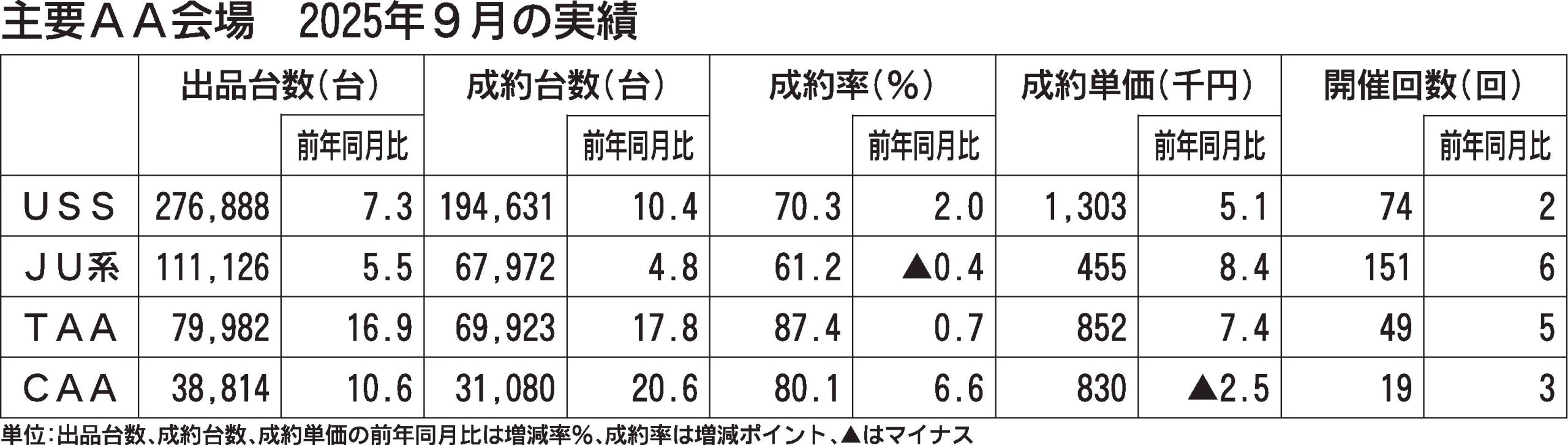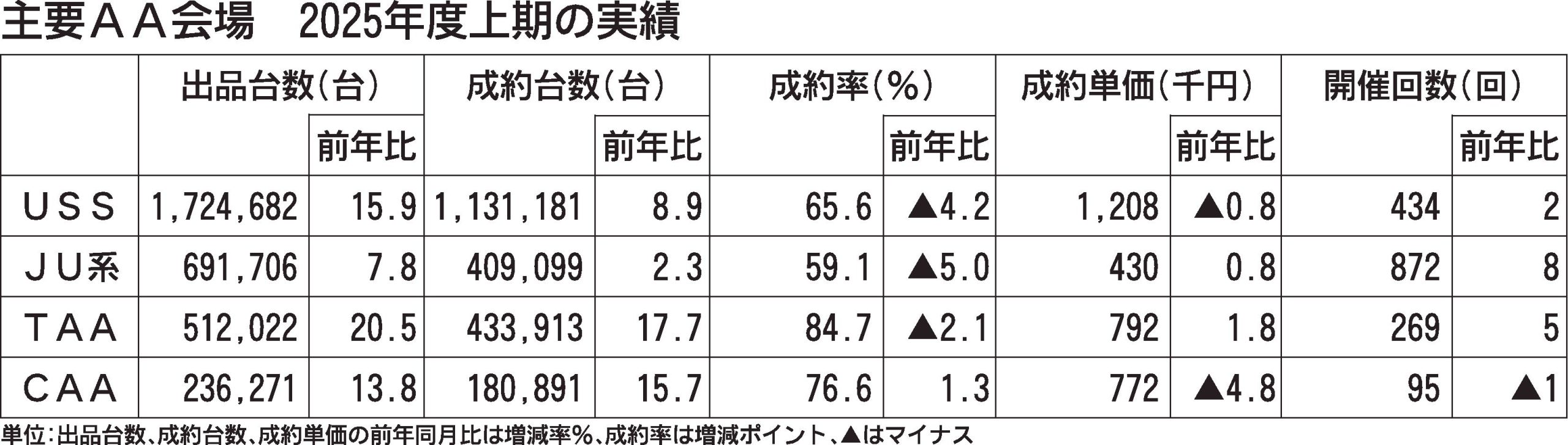 中古車オークション(AA)の主要4事業者が発表した2025年度上期(4~9月)の出品台数は、いずれも前年同期を上回った。2桁増の伸びを示した事業者が大半で、中古車の流通量が回復していることを示す。成約台数も全社プラスだったものの、出品の勢...