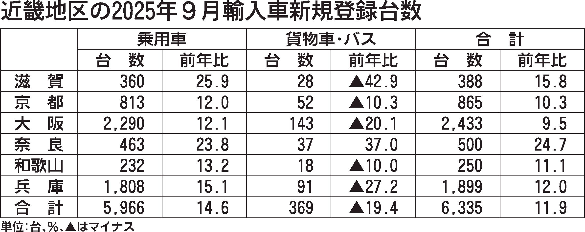 日本自動車輸入組合(JAIA)の発表によると、2025年度上期(4~9月)の近畿地区の輸入車新規登録台数(外国メーカー車と日本メーカー車)は前年同期比8.0%増の2万7616台で、年度上期として3年連続で増加した。車両供給の回復や新型車の...