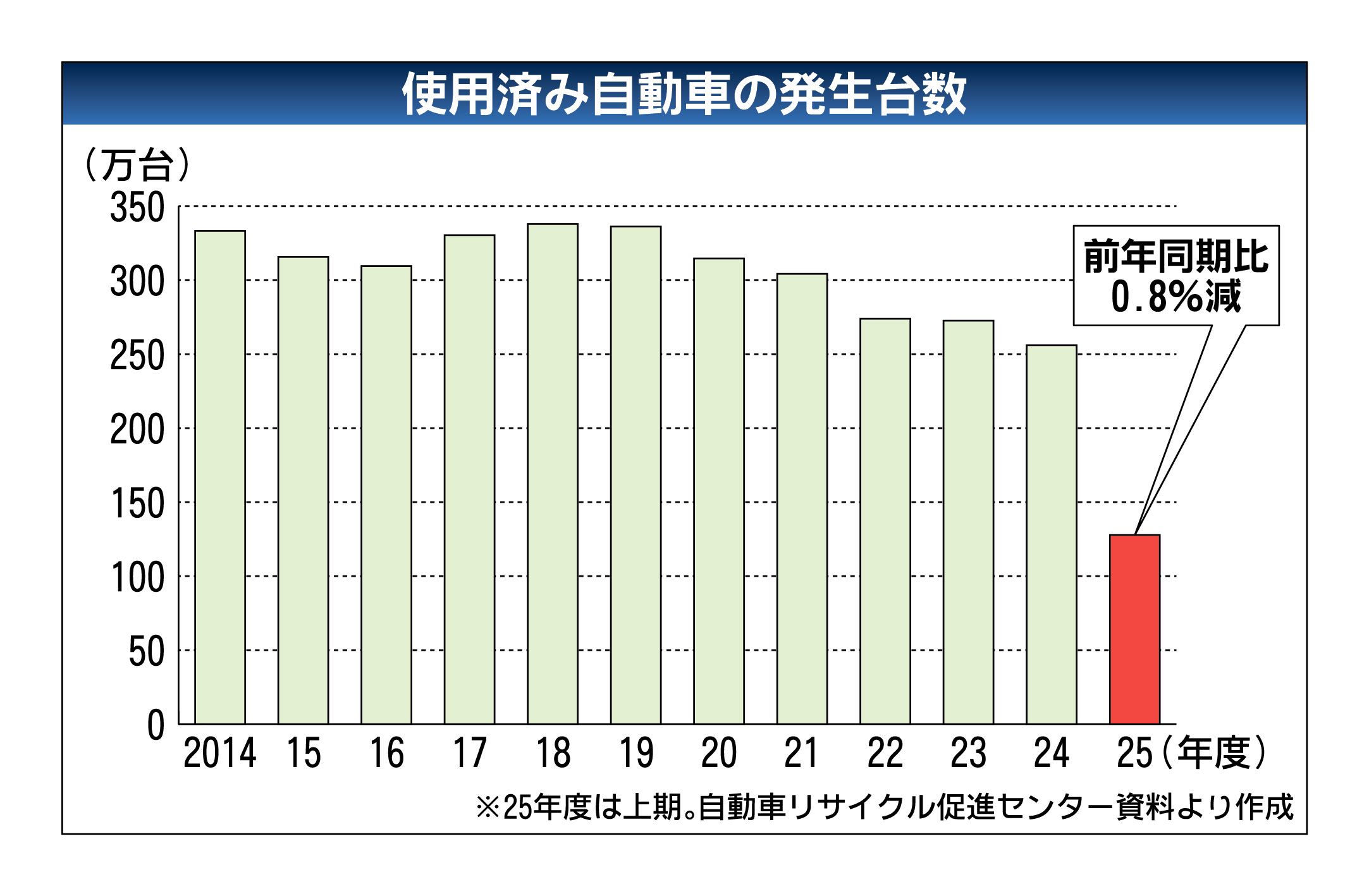 自動車リサイクル促進センター(JARC、細田衛士理事長)によると、2025年度上期(4~9月)の使用済み自動車の発生台数は前年同期比0.8%減の127万8千台だった。同期として4年連続のマイナスだったが、縮小幅は改善(24年度上期は同5....