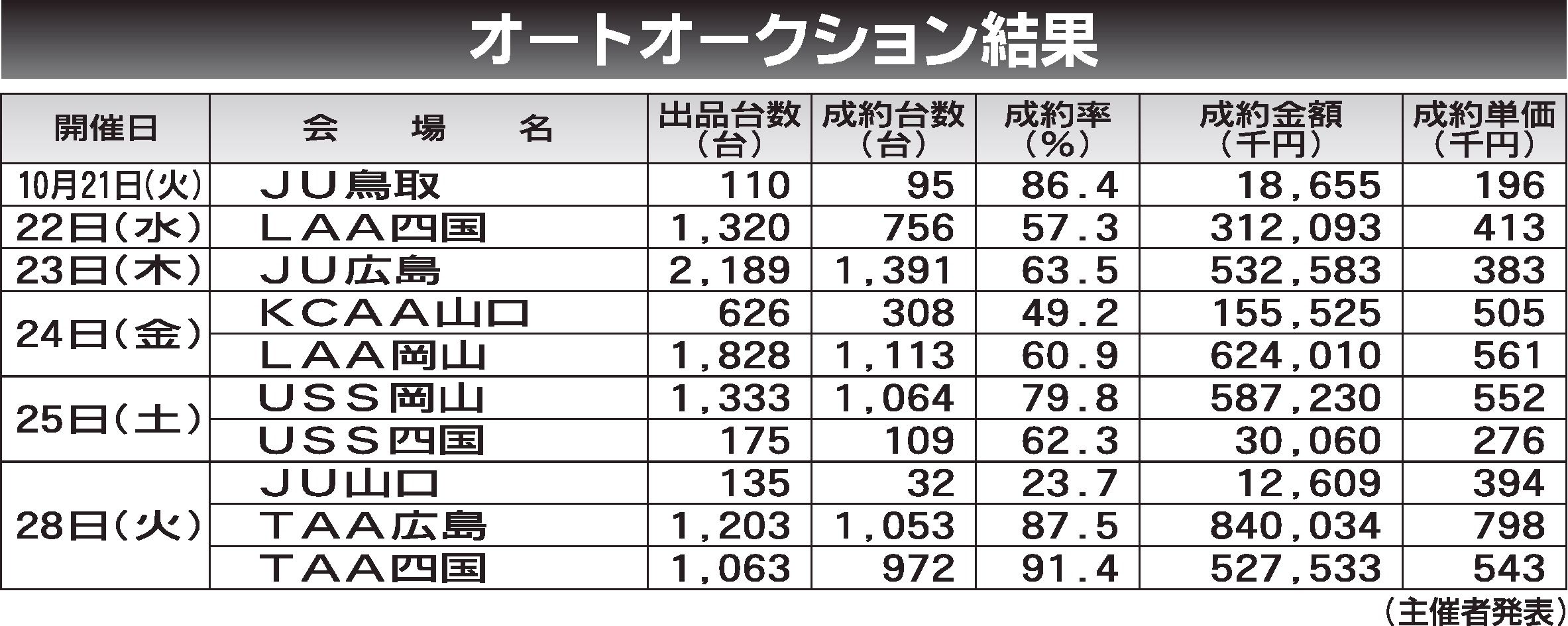 〈オートオークション結果〉中・四国地区 2025/10/21~28