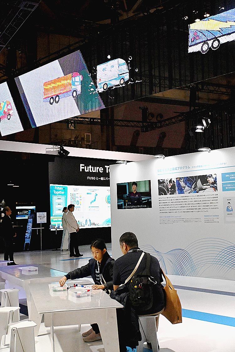 三菱ふそうトラック・バスのブースでは、トラックの塗り絵が楽しめる。完成した塗り絵はスキャンで取り込み、ブース上部に取り付けられた画面上に投影する。世界で1台だけのオリジナルトラックが、画面上を軽快に走っていく様子を楽しむことが出来る。 「...