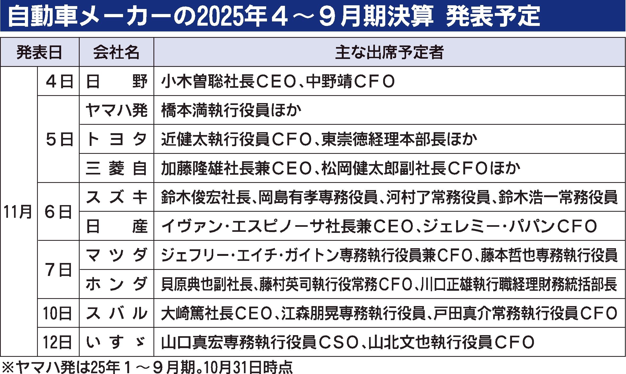 国内自動車メーカーの2025年4~9月期決算発表が4日の日野自動車からスタートする。米国の追加関税による上期の業績影響に加え、新たに生じた半導体の供給不安を通期見通しにどの程度、反映させるかや、主要自動車市場の先行きをどう見通すかが焦点と...