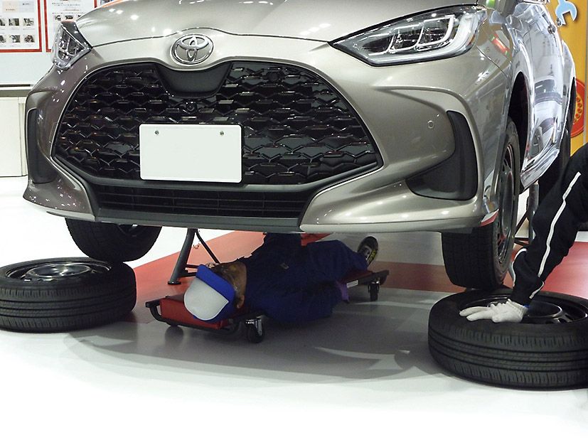 このうち「カーディーラー整備士の仕事」では、ディーラーを訪れるユーザーからクルマを預かったと想定。電動レンチを使用して実際にタイヤを運んで交換したり、寝板を使って車両下回りを点検したりしていた。