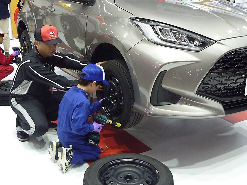 自動車業界団体でつくる「自動車整備人材確保・育成推進協議会」と国土交通省は共同で、未就学児や小学生が実物のクルマや工具に触れながら、整備の楽しさを体験できるブース「チャレンジ!未来の自動車整備士(カードクター)!」を出展。官民が連携し、整備士体験ブースを出すのは、前回のJMS2023に次いで2回目だ。