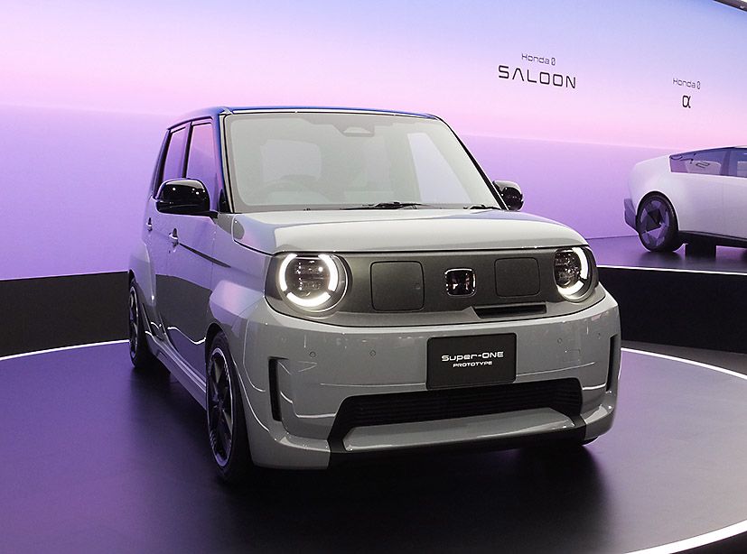 EVでは「N-ONE e:」ベースの高性能EV「スーパーワン」のプロトタイプも初公開した。日本では26年に発売予定で、迫力のあるブリスターフェンダーを備えたデザインに、旧来のクルマ好きは否が応でも往年の「シティ・ターボII」、通称「ブルドッグ」の姿を連想する。幅広いフェンダーは当然、軽規格には収まらないので、登録車扱いとなる。