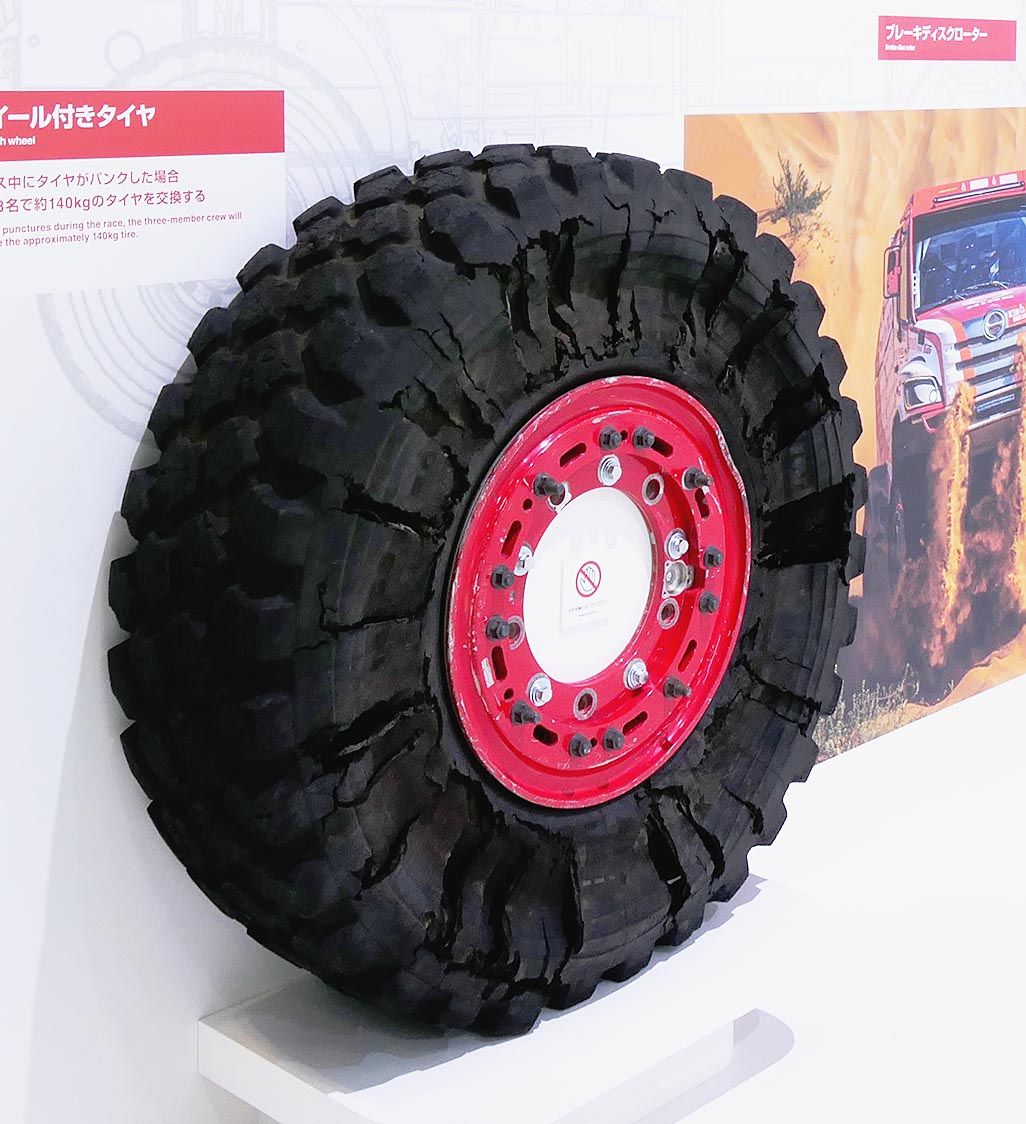 日野自動車のブースには、同社が参戦する「ダカールラリー」で使用された部品が展示されている。中でも重さ140キログラムの巨大なタイヤはずたずたに引き裂かれ、エンジンの動力をタイヤに伝える金属部品は溶けて変形している。 いずれも世界的な自動車...