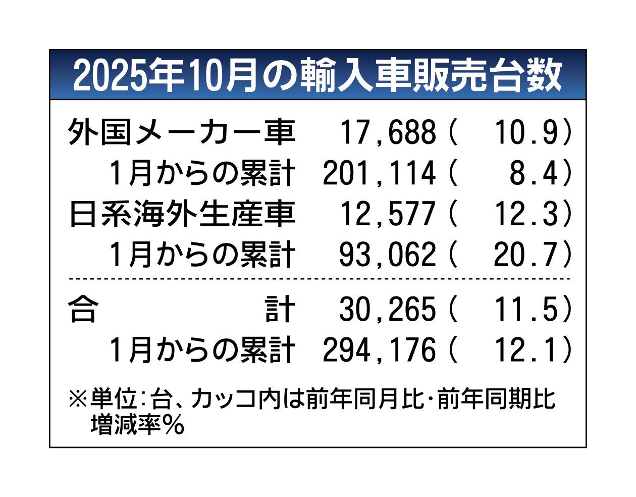 日本自動車輸入組合(JAIA、ゲルティンガー剛理事長)が11月7日に発表した2025年10月の外国メーカー車の新規登録台数は、前年同月比10.9%増の1万7688台となり、10カ月連続で増加した。登録車全体に占める外国メーカー車のシェアは7.1%だった。また、電気自動車(EV)は同34.4%増の2562台で、24年11月以降12カ月連続で増加。外国メーカー車に占めるEVの割合は、同2.5ポイント増の14.5%だった。